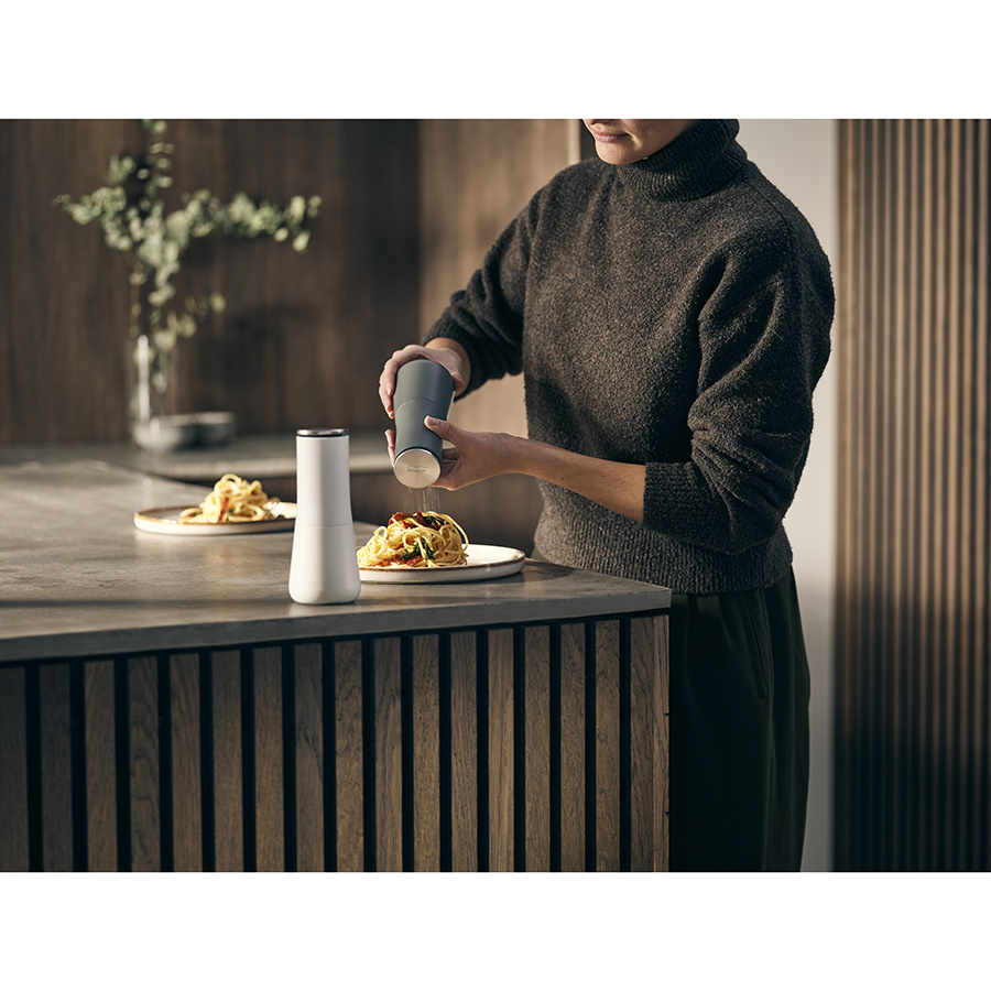Для использования необходимо перевернуть мельницу вверх дном и повернуть основание. Внутри расположена надежная керамическая мельница. С помощью вращающейся верхней части девайса можно регулировать размер помола соли и перца. Изделия выполнены из высококачественного пластика.