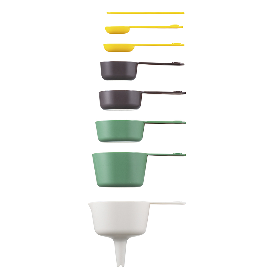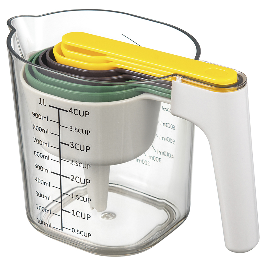 Материалы: АБС-пластик, термопластичная резина, полистирол. Объемы ложек: 7,5 мл, 15 мл, 60 мл, 85 мл, 125 мл, 250 мл. Объем кувшина: 1 л. Количество предметов в наборе: 9 шт.