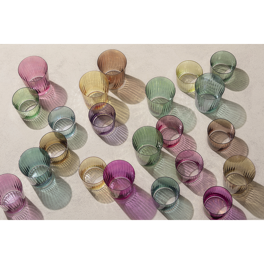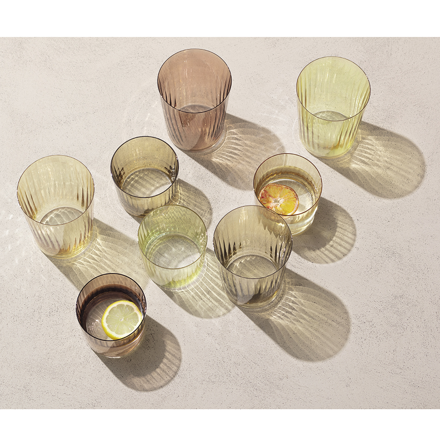Gems – коллекция тумблеров из разноцветного стекла станет ярким дополнением к любому столу. При создании посуды дизайнеры вдохновлялись красотой переливающихся на солнце жемчужин. Линейка представлена наборами из 4 тумблеров в трех цветовых гаммах и двух размерах. Изделия выполнены вручную в разных оттенках из выдувного стекла изумрудного, янтарного и гранатового цвета. Рифленая текстура бокалов отражает солнечный свет и создает красочный эффект блеска.