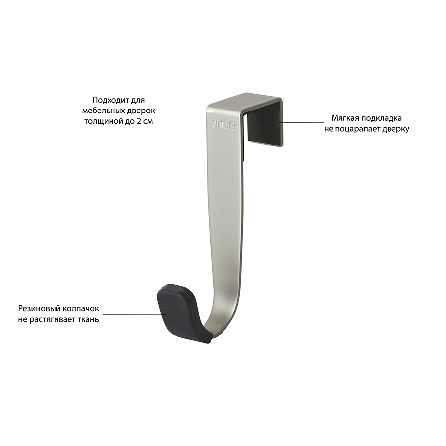 Изделия выполнены из штампованного металла высокого качества. Благодаря никелевому покрытию изделия не поддаются ржавлению и сохраняют привлекательный вид на протяжении всего срока эксплуатации. Изделия легко крепятся к дверцам шкафчиков без использования клея и дюбелей. Специальная накладка препятствует скольжению крючков по поверхности. Аксессуары с резиновыми наконечниками защищают одежду от повреждений.