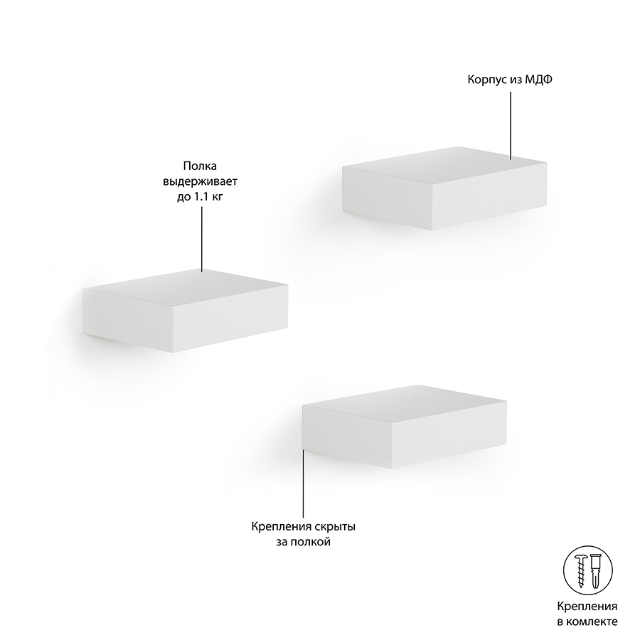 Каждая полка выдерживает вес до 1 кг. Изделия легко крепятся к стене, все нужные материалы в комплекте. Рамер одной полки - 10х8,5 см.