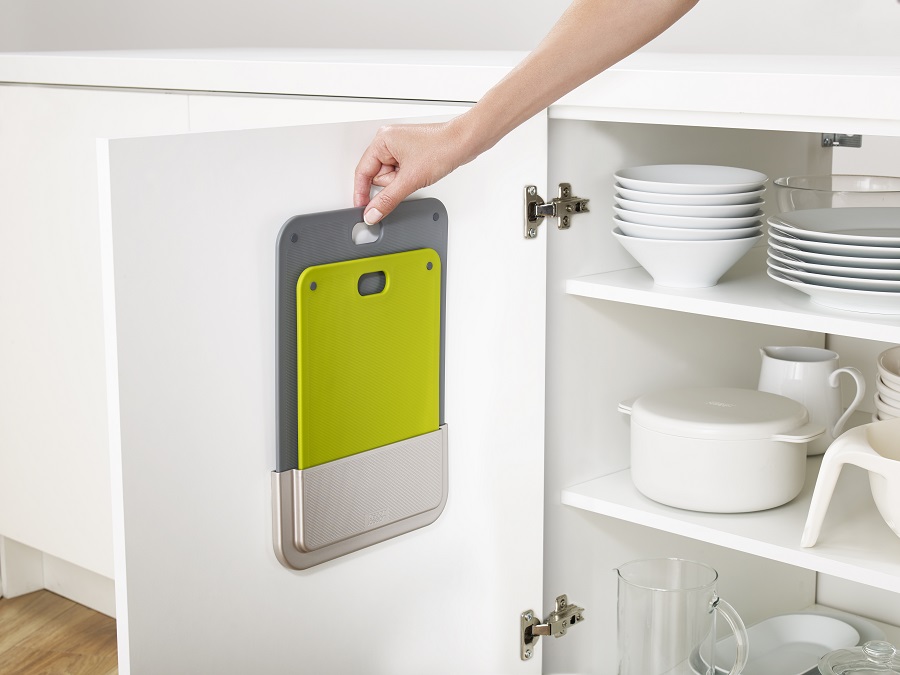 За счет уникальной разработки дизайнеров Joseph Joseph можно рационально использовать пространство внутри кухонного шкафа. Держатель легко крепится к задней части двери с помощью прочной клейкой ленты 3M VHB. В комплект входит две доски разного размера с резиновыми ножками, которые препятствуют скольжению по кухонной поверхности.