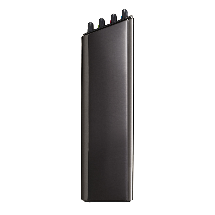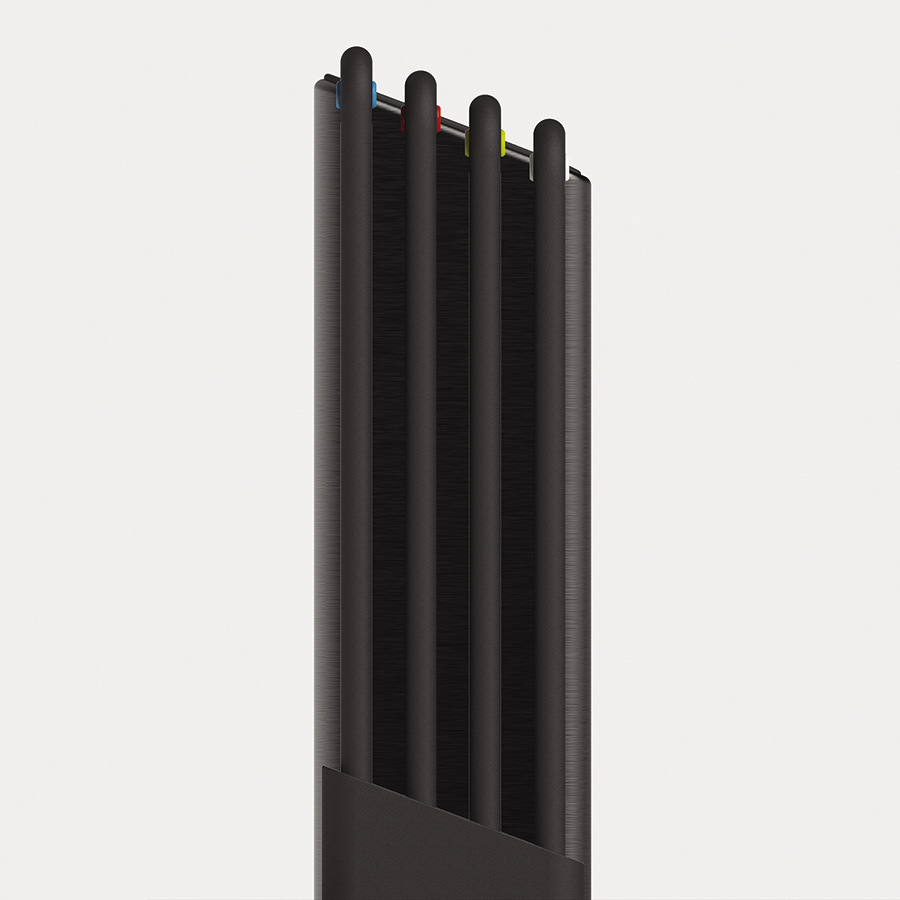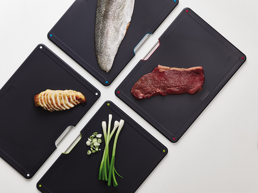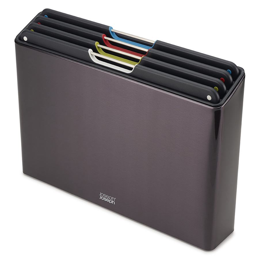 В комплект входит 4 черные доски с закругленными углами и нескользящими ножками. Небольшие края по контуру удерживают сок и крошки нарезаемых продуктов. При создании изделий мастера используют высококачественный пластик, который не затупляет ножи и при резке не оставляет микроскопических частиц на пище. На текстурированной поверхности досок не заметны царапины. Простая и вместе с тем эффективная цветная кодировка позволяет легко распределять доски для разных типов продуктов, сохраняя максимальную гигиену в процессе нарезки и исключая взаимное загрязнение продуктов. Эргономичная ручка в виде металлического прутика , ,дает возможность легко брать аксессуар во время готовки. Подставка для хранения удерживает аксессуары на расстоянии, позволяя воздуху равномерно циркулировать между ними.