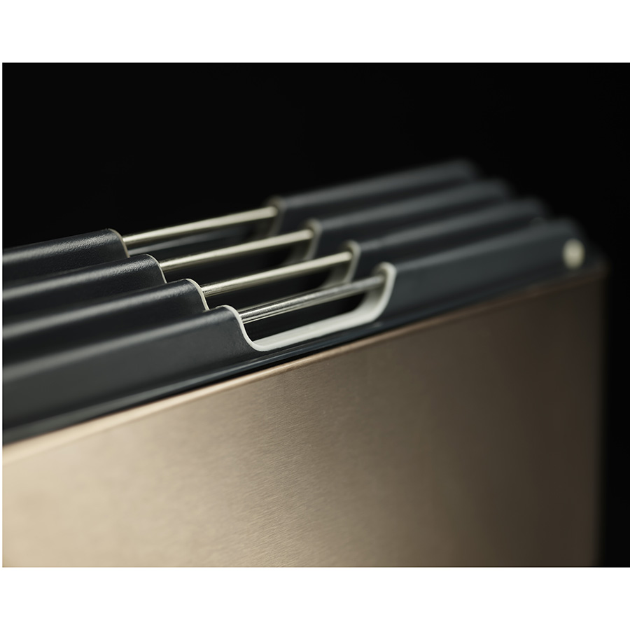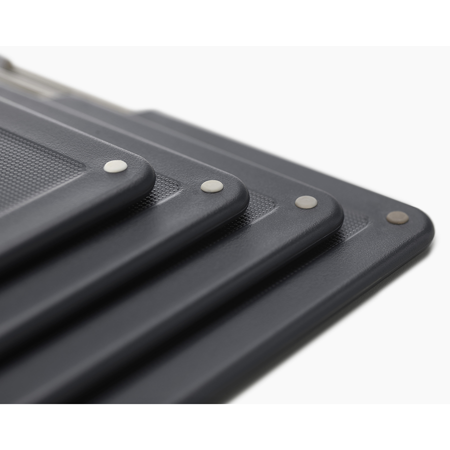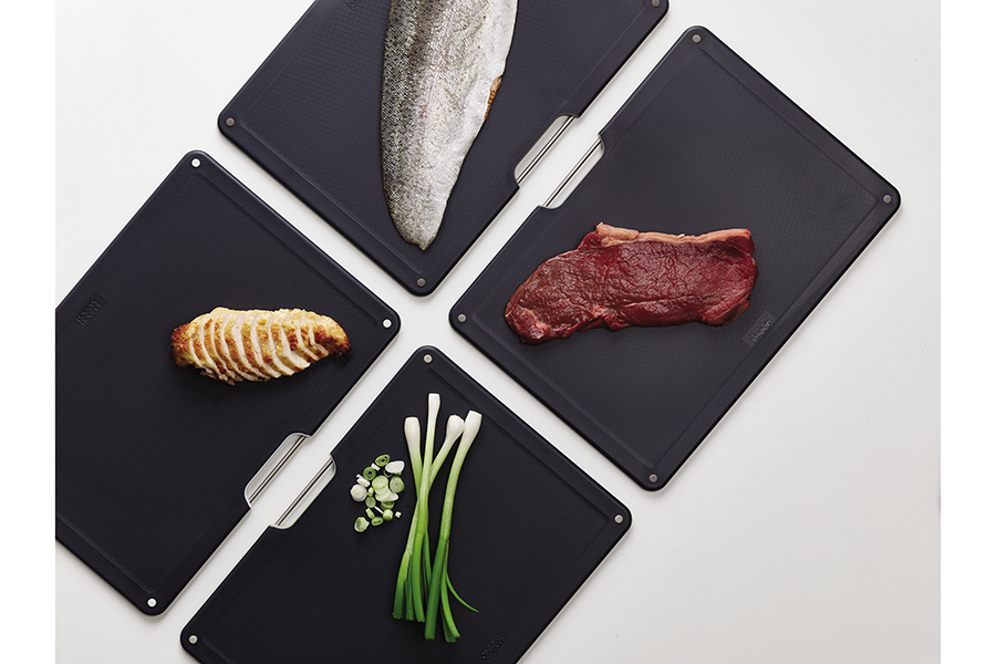 В комплект входит 4 черные доски с закругленными углами и нескользящими ножками. Небольшие края по контуру удерживают сок и крошки нарезаемых продуктов. При создании изделий мастера используют высококачественный пластик, который не затупляет ножи и при резке не оставляет микроскопических частиц на пище. На текстурированной поверхности досок не заметны царапины. Простая и вместе с тем эффективная цветная кодировка позволяет легко распределять доски для разных типов продуктов, сохраняя максимальную гигиену в процессе нарезки и исключая взаимное загрязнение продуктов. Эргономичная ручка в виде металлического прутика , ,дает возможность легко брать аксессуар во время готовки. Подставка для хранения удерживает аксессуары на расстоянии, позволяя воздуху равномерно циркулировать между ними.