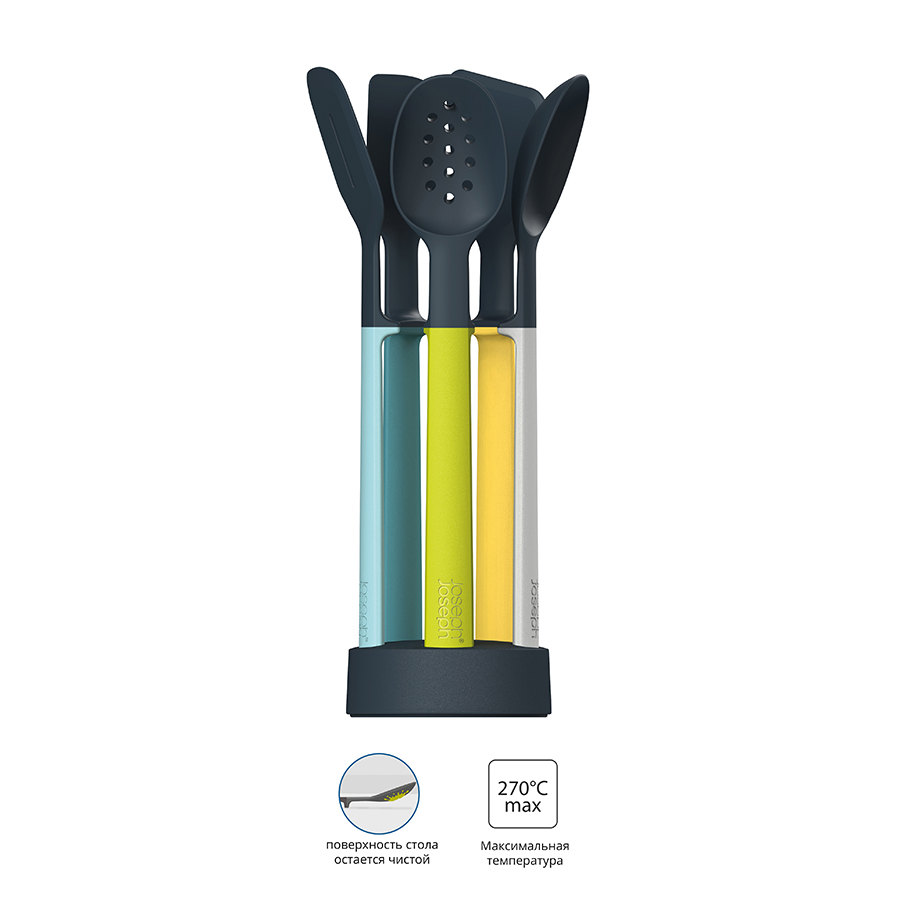 В набор входит 5 инструментов: лопатка для переворачивания продуктов во время приготовления, поварская ложка для перемешивания ингредиентов, лопатка-шумовка для пассировки, ложка-шумовка для ивлечения приготовленной пасты и пельменей и лопатка-спатула для размешивания теста и соусов. , ,Удобная подставка обеспечивает компактное хранение, с её помощью инструменты всегда будут под рукой. Все инструменты выполнены из жаропрочного силикона, который выдерживает температуру до 270°C. Подходит для совместного использования с противопригарной посудой.