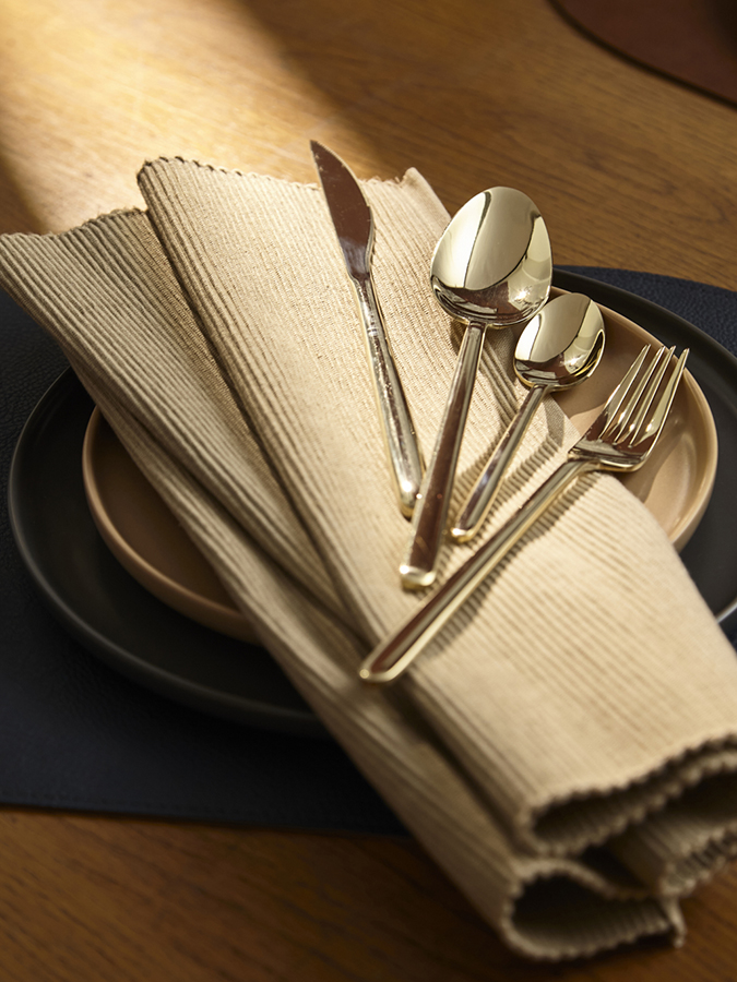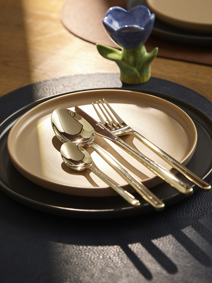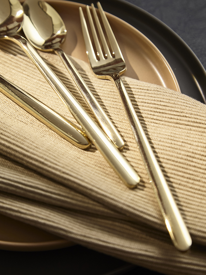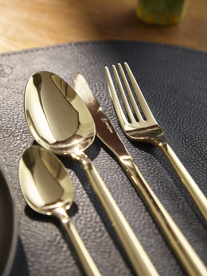 - Столовые приборы золотистого цвета с зеркальной полировкой идеально вписываются в классическую и традиционную сервировку, прекрасно сочетаясь с белоснежной скатертью и фарфоровой посудой. В современных решениях они могут служить ярким акцентом на фоне простых и лаконичных элементов.