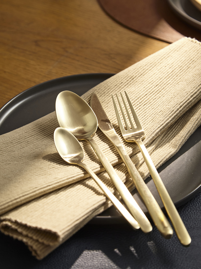 - Столовые приборы золотистого цвета с матовой полировкой отлично подойдут для сервировки в традиционном и современном стиле. Их сдержанная элегантность прекрасно гармонирует с простыми формами и нейтральными цветами.