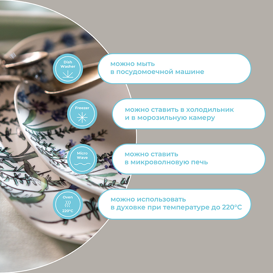Можно мыть в посудомоечной машине, ставить в микроволновую печь, морозильную камеру, а также использовать в духовке при температуре не выше 180 °C.