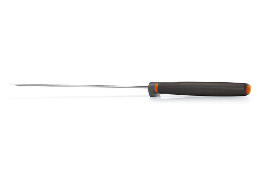 Острое лезвие с серрейторной заточкой изготовлено из высококачественной нержавеющей стали. Дизайн ножа специально разработан для минимизации беспорядка, возникающего во время готовки. Благодаря специальному утяжелителю, встроенному в рукоятку, лезвие приподнято над рабочей поверхностью и не загрязняет её. Нож рекомендуется мыть вручную и вытирать насухо. Аксессуар поступает в продажу в защитных ножнах для безопасного хранения.