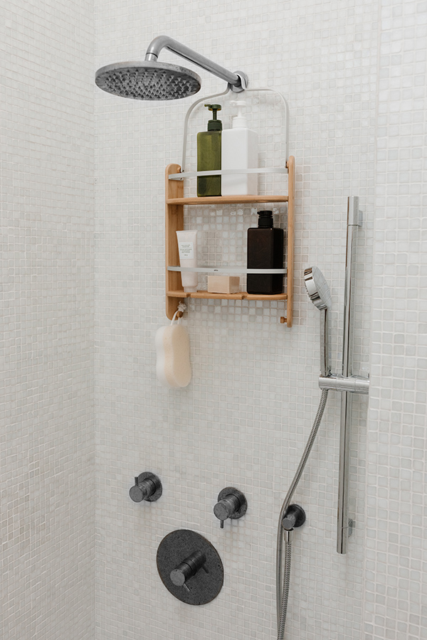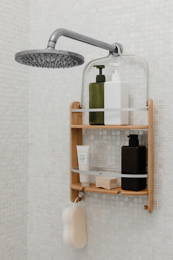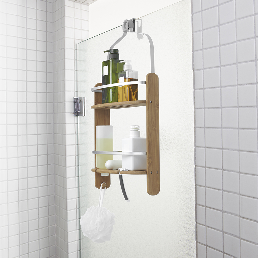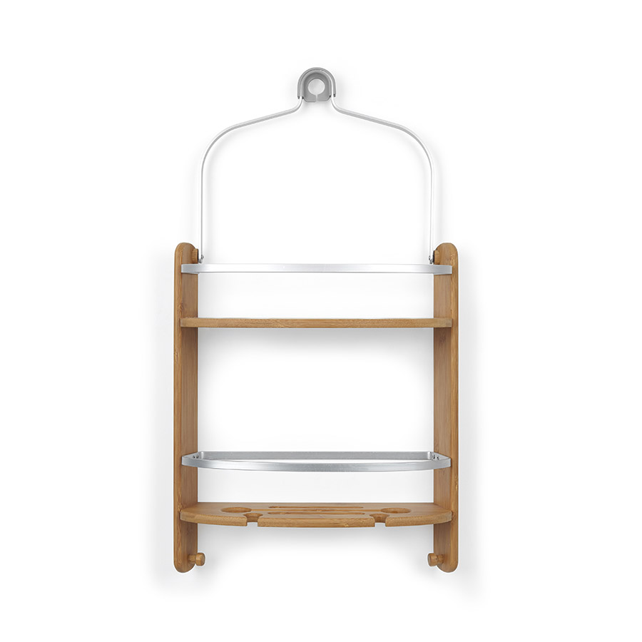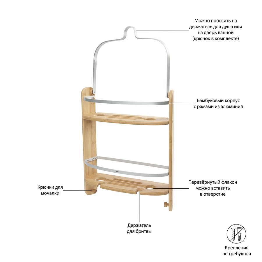 Две вместительные полочки, на которых помещаются даже очень большие бутылки с шампунями и гелями. В каждой предусмотрены отверстия, чтобы перевернув пузырек вверх ногами, вы использовали его как диспенсер. В нижней полке есть специальные отверстия для хранения бритвенных станков. Два крючка снизу, чтобы повесить мочалки. Прочная основа из бамбука удерживает большой вес, а металлический держатель со специальным силиконовым крючком , ,позволит повесить органайзер на крепление для душа или штангу для шторки в ванной.