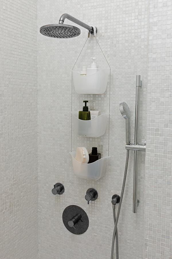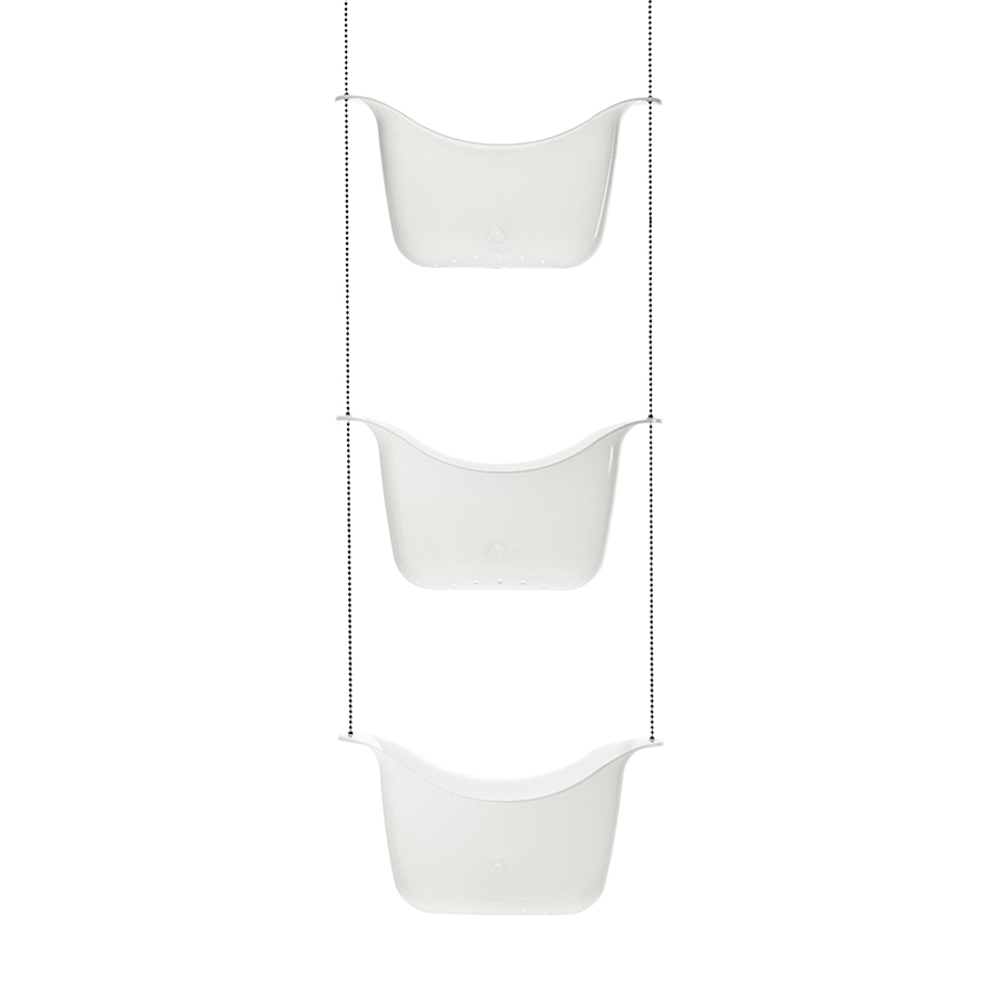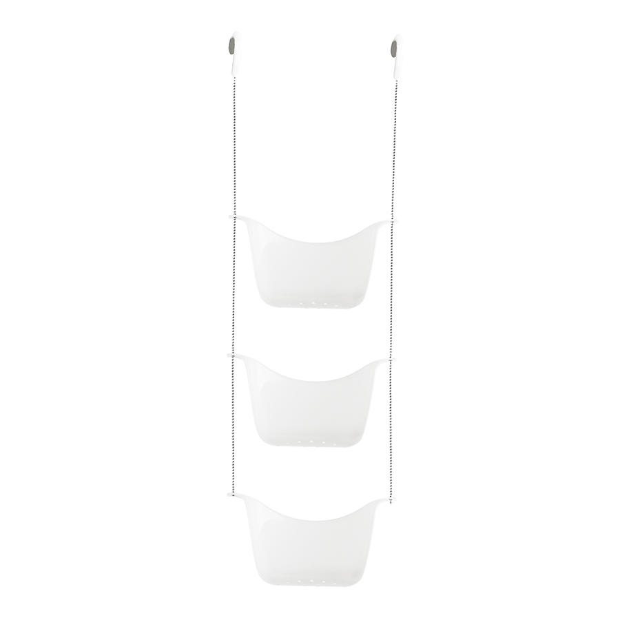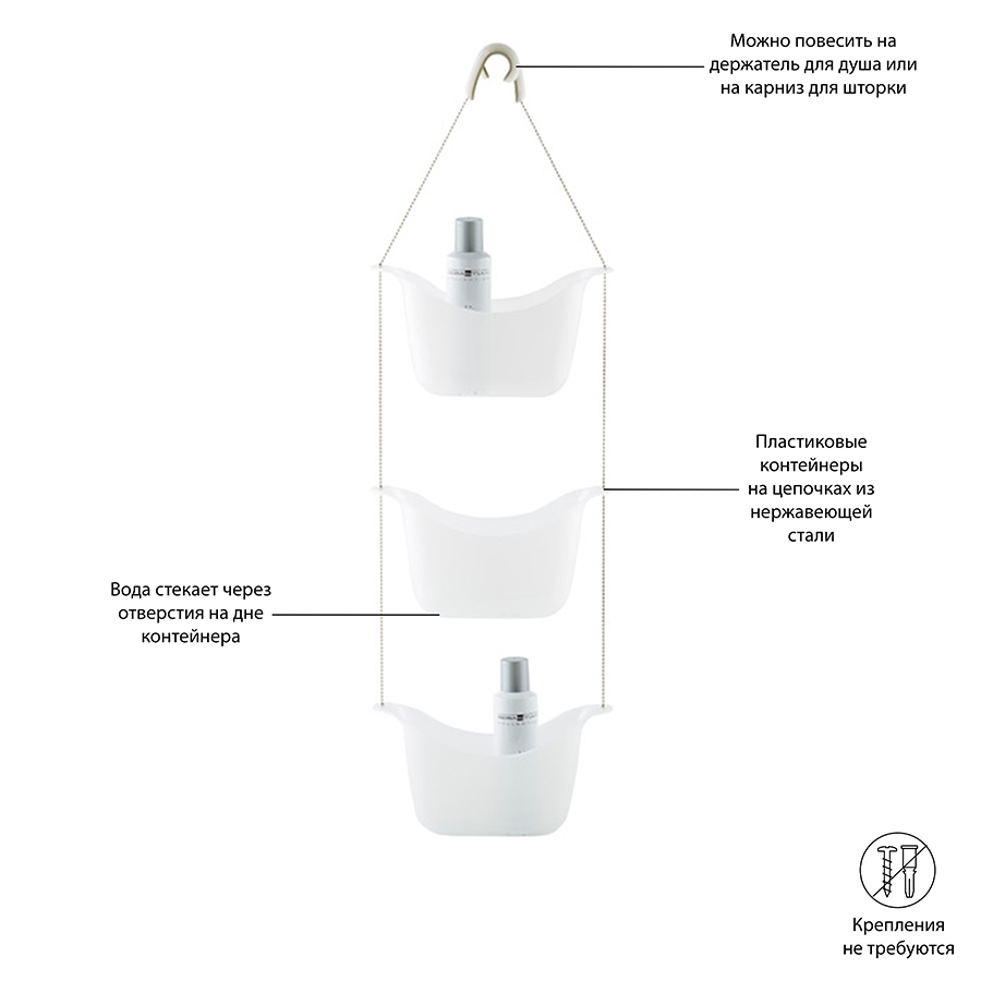 Три корзины, соединенные цепочкой из нержавеющей стали, плюс два специальных крючка, которые позволяют повесить конструкцию на крепление для душа или штангу для шторки в ванной.
