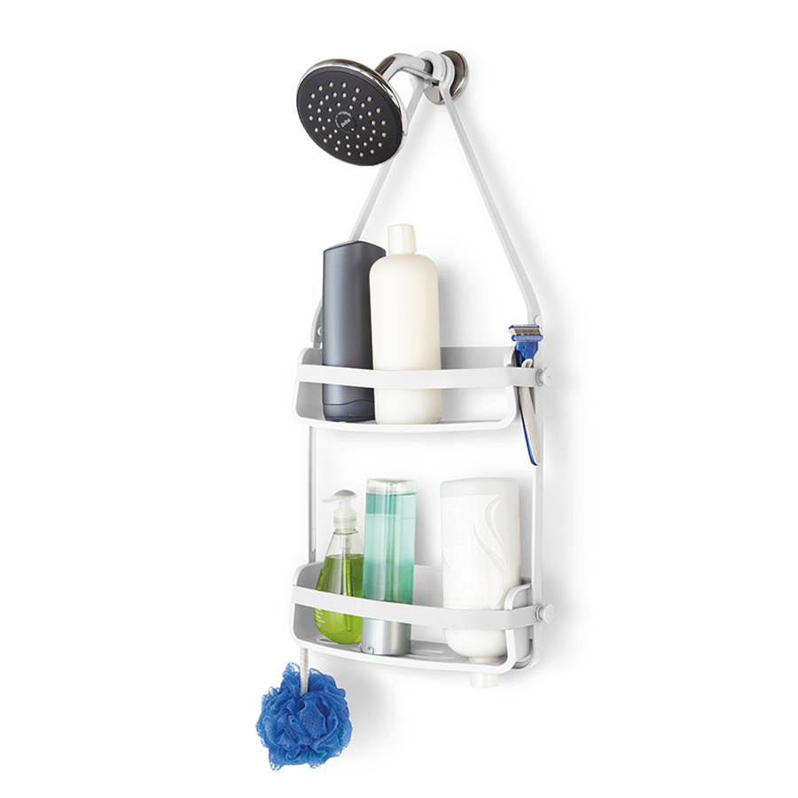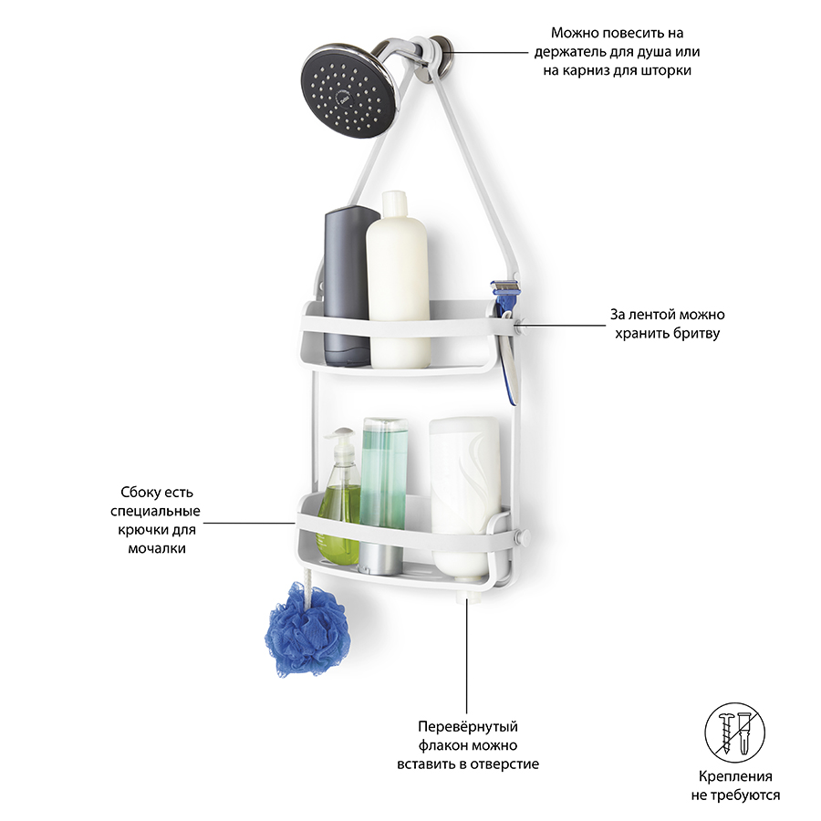 Прочная основа выдерживает до 3,5 кг. В каждой полке предусмотрены отверстия, которые позволяют, перевернув флакон с гелем или шампунем, использовать его как диспенсер. , ,Силиконовые ленты со специальными крючками , ,позволяют повесить органайзер на крепление для душа или на штангу для занавески.