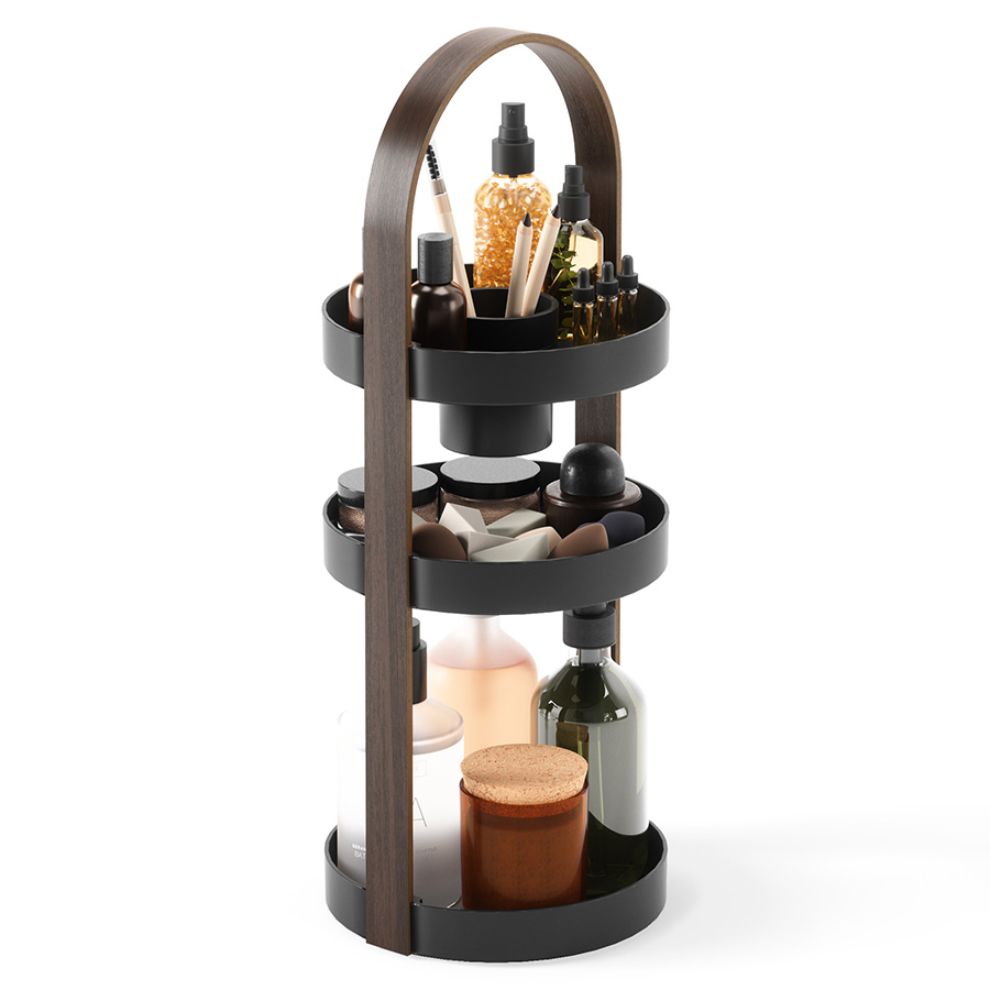 "Органайзер Bellwood представляет собой вместительную трехуровневую конструкцию с ручкой для удобной переноски. Благодаря компактности и минималистичному дизайну такой аксессуар великолепно смотрится на туалетном столике, а также в интерьере ванной комнаты. Вы можете использовать лотки для хранения косметики, уходовых средств, полотенец и многого другого. Съемная чаша, расположенная по центру, идеально подходит для размещения кистей для макияжа и различных инструментов. Органайзер на 60%, выполнен из переработанного АБС-пластика, известного своей прочностью, устойчивостью к износу и долговечностью. Элементы из натуральной древесины тополя привносят в дизайн природное очарование.
