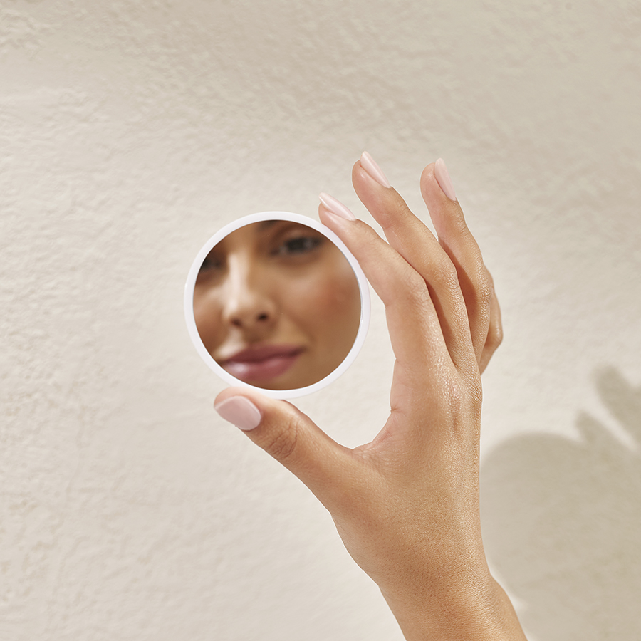 Он оснащен большим зеркалом, обеспечивающим широкий обзор лица и шеи, а также малым зеркалом с трехкратным увеличением для работы с деталями.