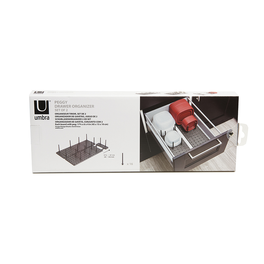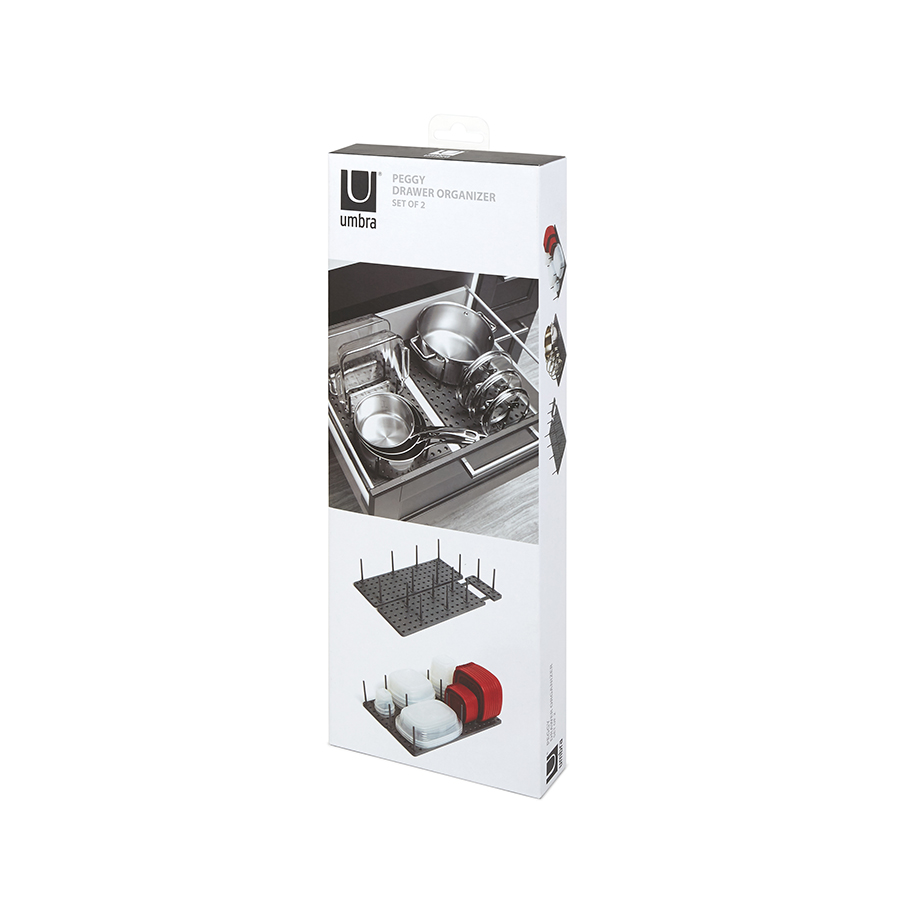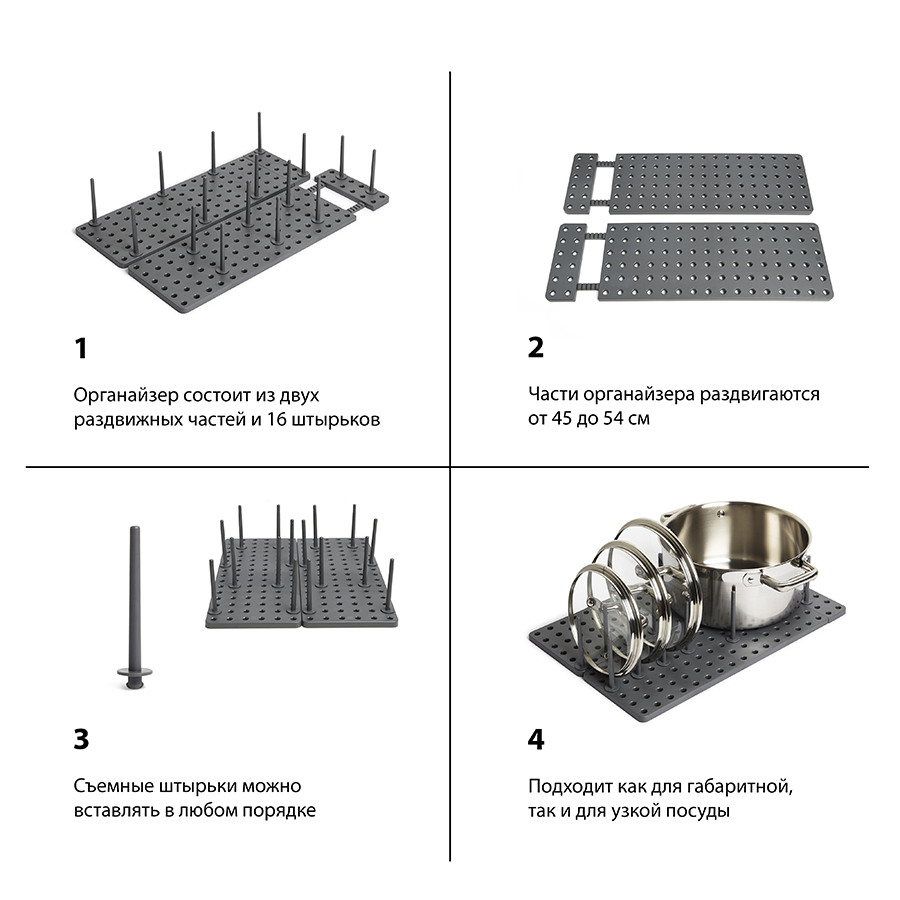 Подложка с отверстиями для штырьков позволяет конфигурировать органайзер так, чтобы он был удобен именно вам. Для особенно крупных предметов предусмотрена часть с раздвигающимся основанием. Просто подгоните его под размер вашей посуды и закрепите. Подходит для всех стандартных кухонных ящиков. Комплект включает 2 подложки и 16 штырьков. Раздвигается до 54.3 см.