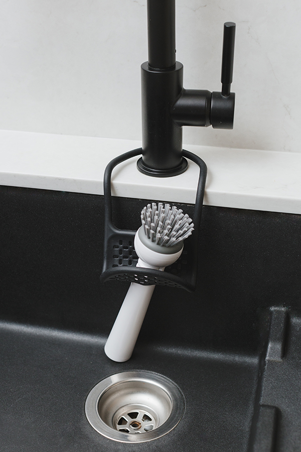 Ручка удобно гнется и позволяет вешать органайзер на водопроводный кран или боковую сторону раковины. Перфорация дает воздуху свободно циркулировать, поэтому губки и щетки будут сохнуть быстрее.
