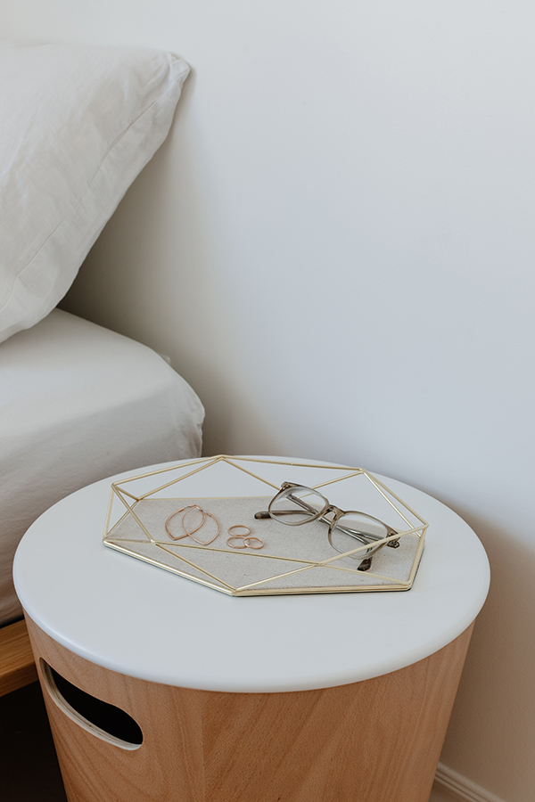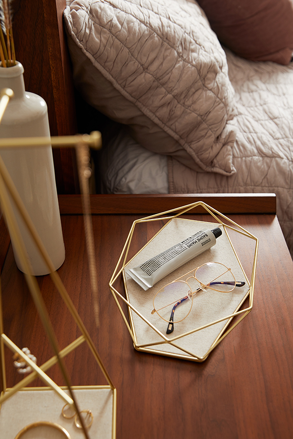 На дне подноса разместятся кольца, браслеты и часы, а «грани» послужат для подвешивания сережек. Льняная поверхность песочного цвета предотвращают повреждение драгоценных камней.