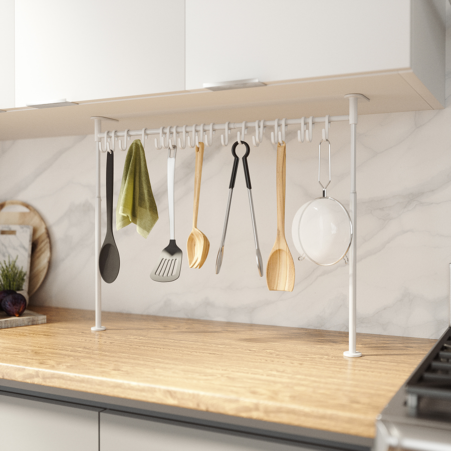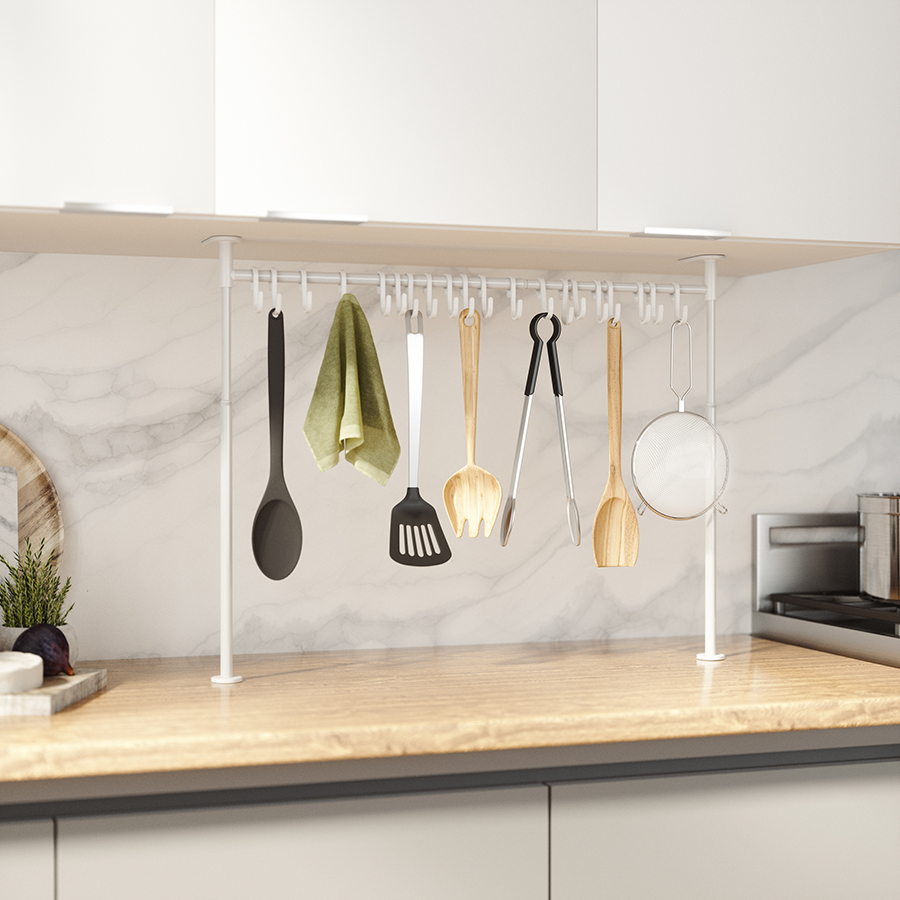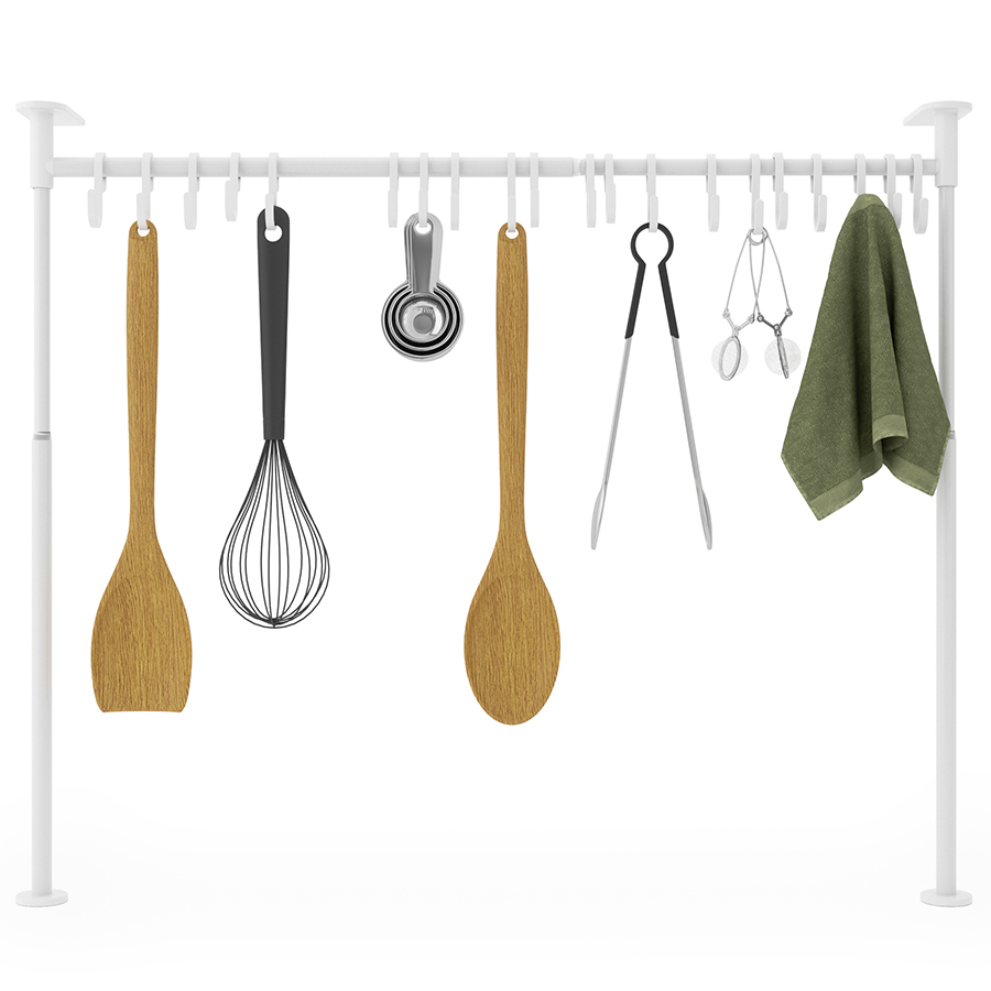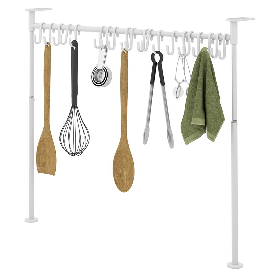 Многофункциональный органайзер оснащен двенадцатью подвесными крючками. Конструкция легко раздвигается без инструментов. Органайзер раздвигается от 38 до 50 см в высоту и от 39 до 61 см в ширину. Мягкие накладки защищают мебель от повреждений.