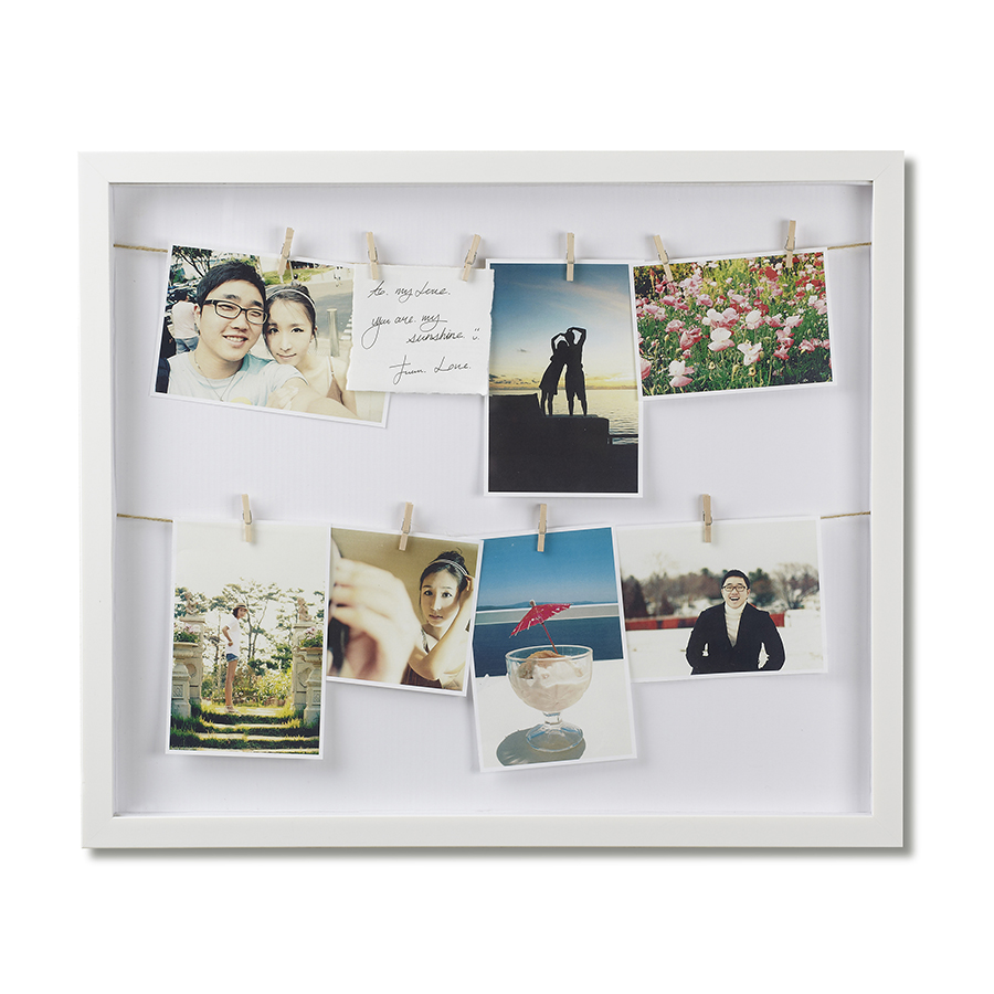 Внутри фоторамки 2 нити, на которые можно крепить фотографии вертикально или горизонатально. В комплекте 12 прищепок, которые помогут в создании индвидуальной композиции. Панно подходит для фотографий размером 10x10 см, 10x15 см или 13x18 см.