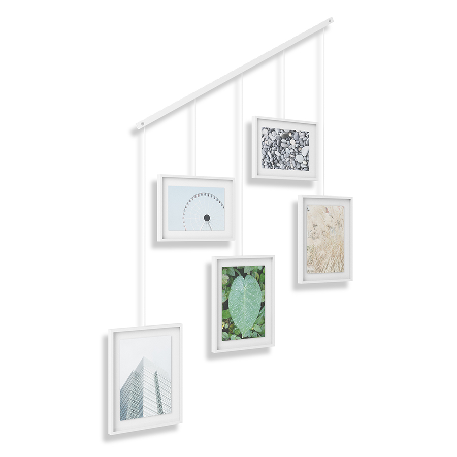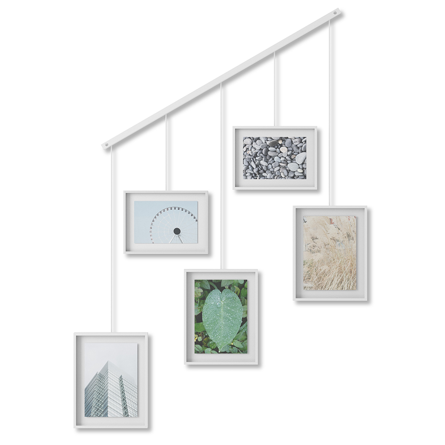 Дисплей состоит из 5 рамок, смонтированных по горизонтали под разным углом. Рамки выполнены из стали и покрыты черной порошковой краской. Каждый снимок или картинка прячется под стеклом. Все рамы зафиксированы на единой планке с помощью зажимов. Основание крепится к стене на шурупы и дюбели, которые входят в комплект.