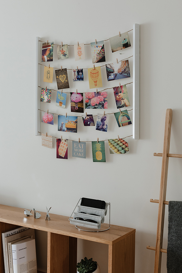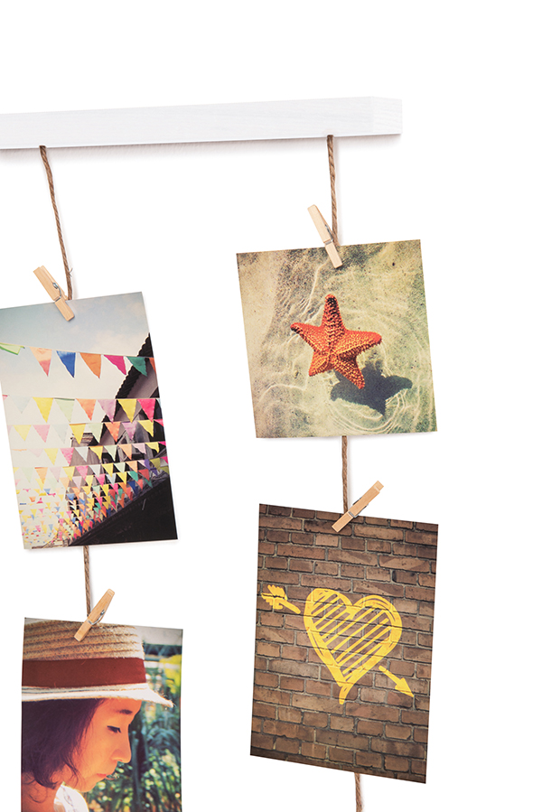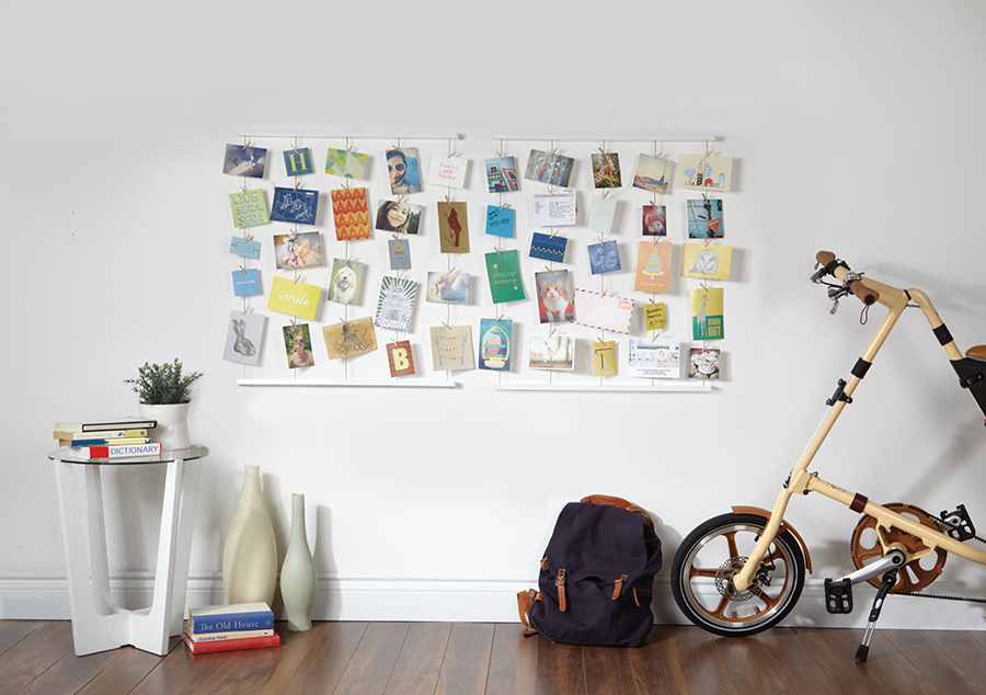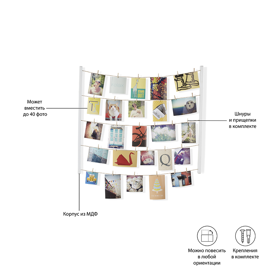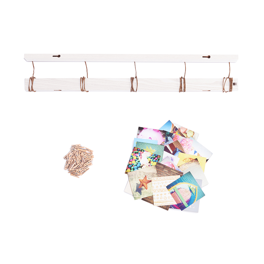 Снимки, открытки, детские рисунки, письма и крепятся на 5 нитях, имитирующих бельевую верёвку. 40 деревянных прищепок идут в комплекте. Композицию легко менять под настроение.