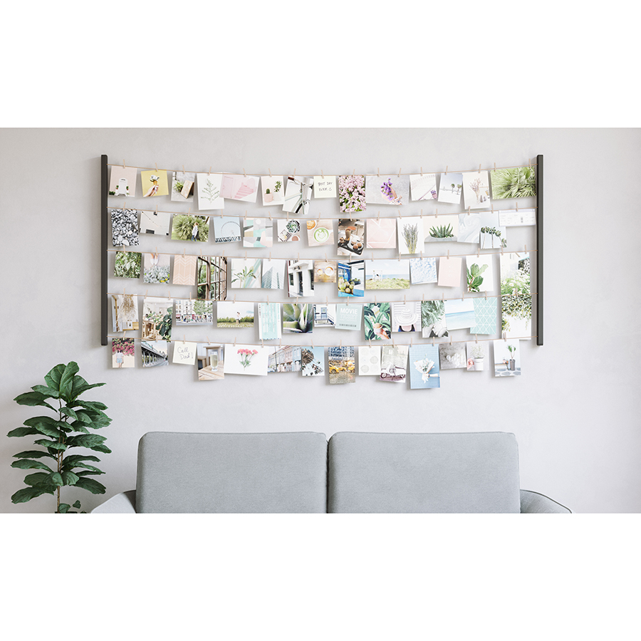 Снимки, открытки, детские рисунки, письма и крепятся на 5 нитях, имитирующих бельевую верёвку. 80 деревянных прищепок идут в комплекте. Композицию легко менять под настроение.