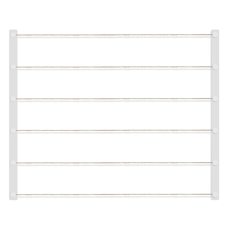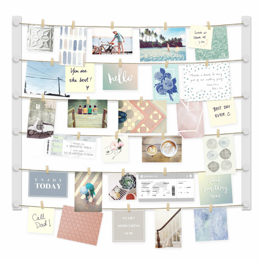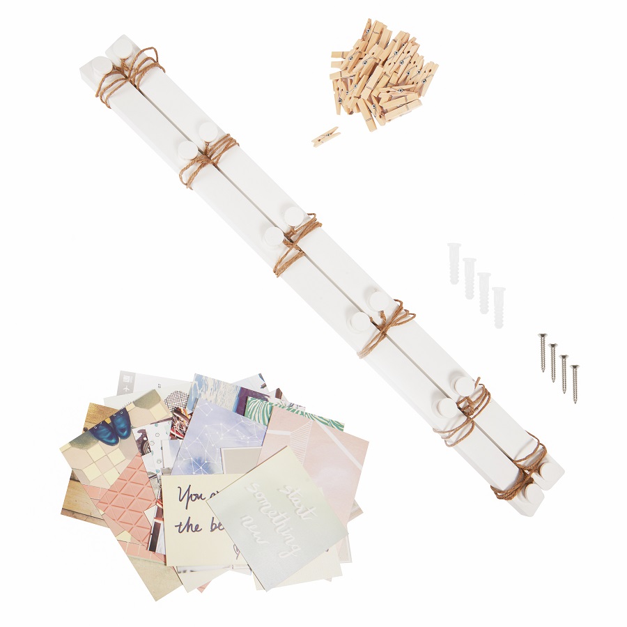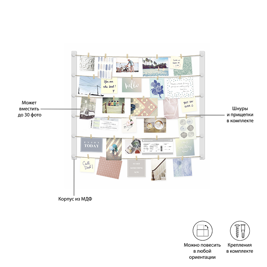 Конструкция состоит из деревянной рамы и шести шпагатных нитей. Для крепления снимков и заметок в набор входит 30 прищепок. Размеры: 81х102х4 см.