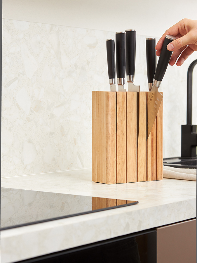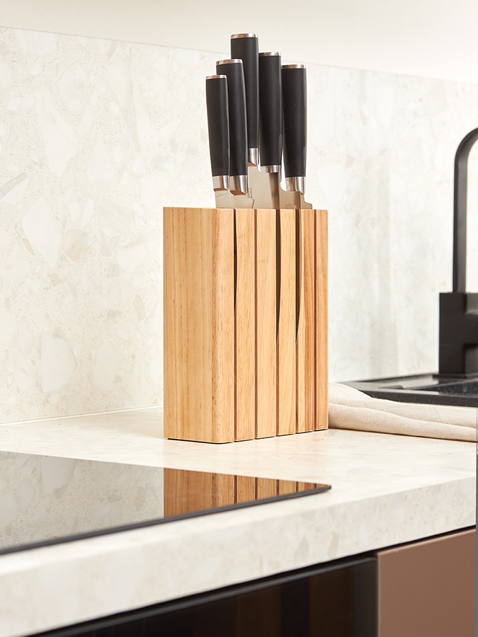 - Универсальность и компактность. Подставка подходит для любых кухонных ножей и не занимает много места.