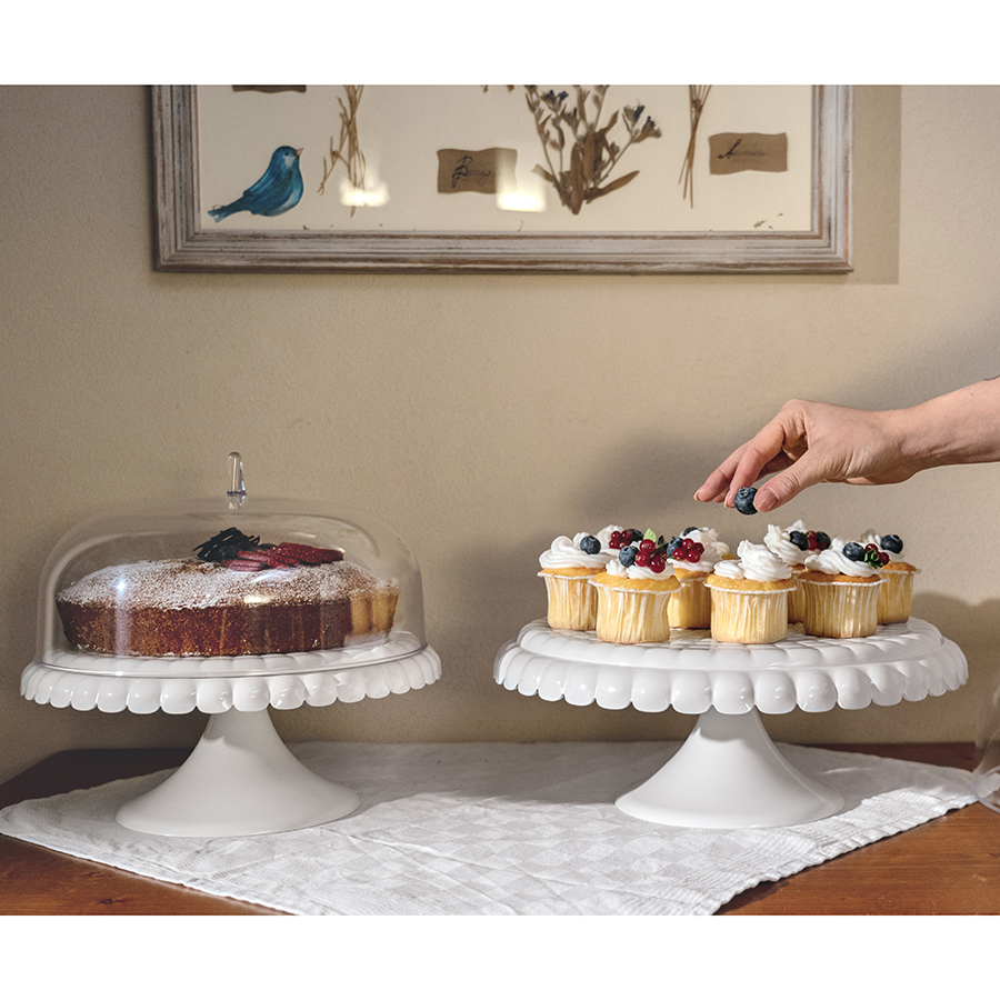Блюдо диаметром 30 см идеально подойдет для подачи выпечки, сладостей, небольших закусок и, конечно, тортов. Крышка защитит продукты от заветривания, насекомых и других внешних факторов, что особенно важно для дачной или уличной сервировки.