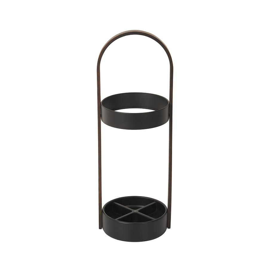 Внутри верхнего стального кольца два крючка для складных зонтов. Дно поделено на секции, расчитанные на 4 зонта-трости.