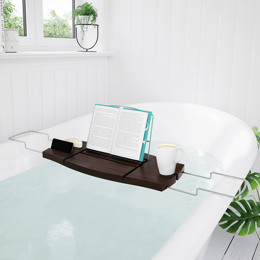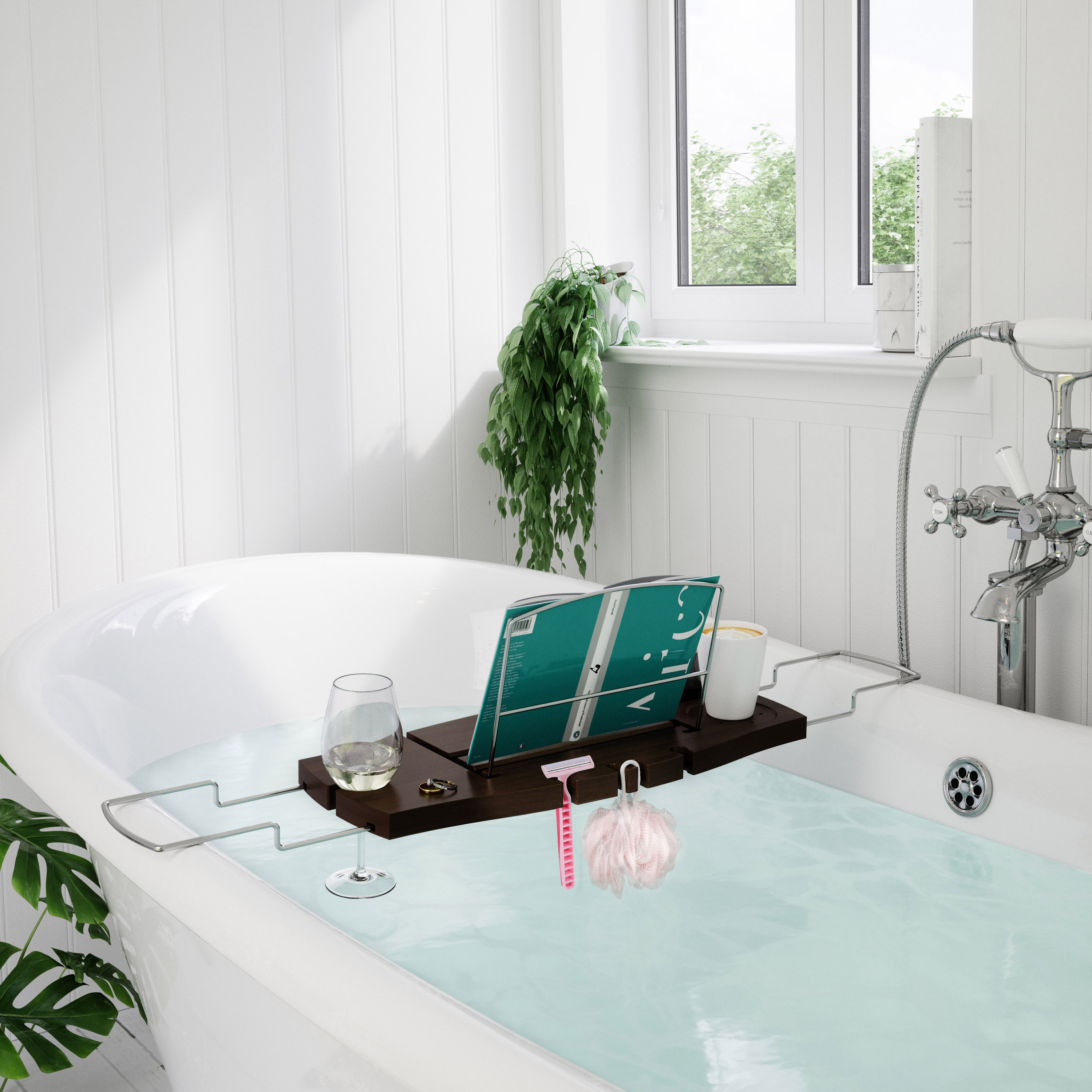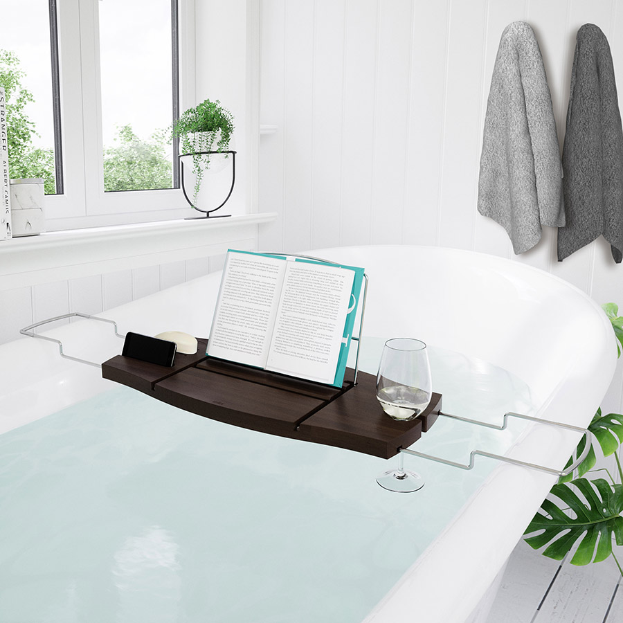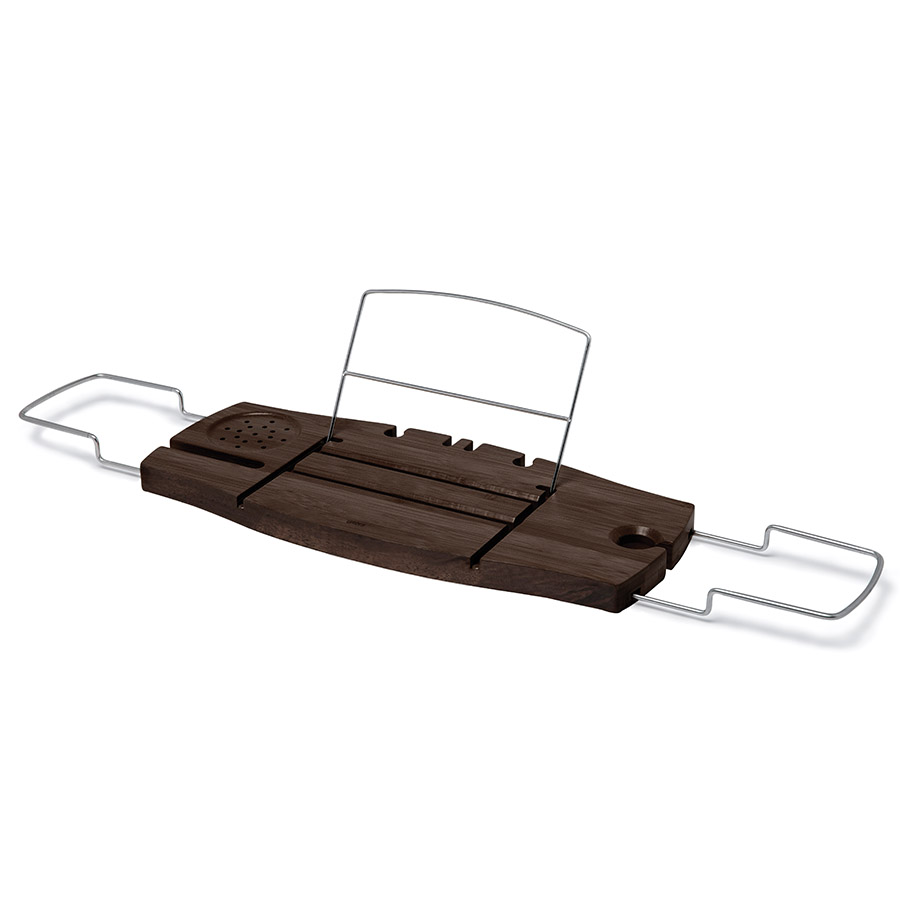 Полка оснащена встроенной мыльницей, прорезью для бокала с вином, подставкой для книги или iPad, отверстием для телефона и держателем для бритвенного станка. Аксессуар выполнен из экологически чистого бамбука, который отличается стойкостью к повышенной влажности. Благодаря выдвижным хромированным кронштейнам полку можно устанавливать на любую ванную шириной до 94 см.