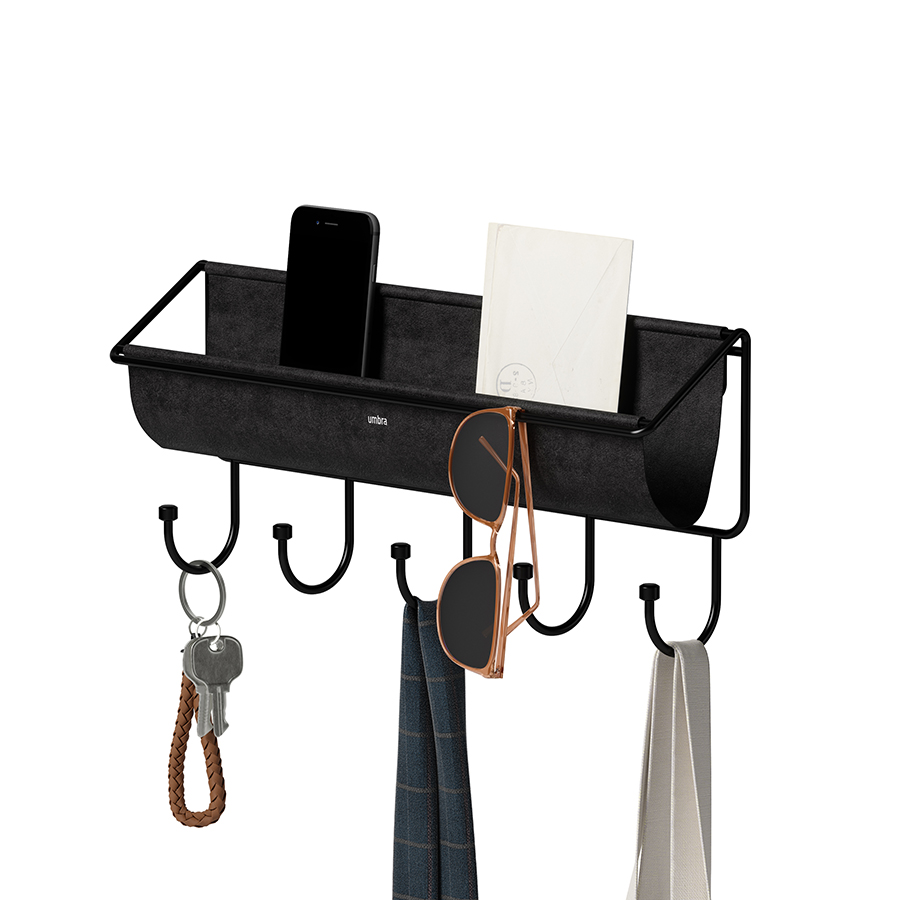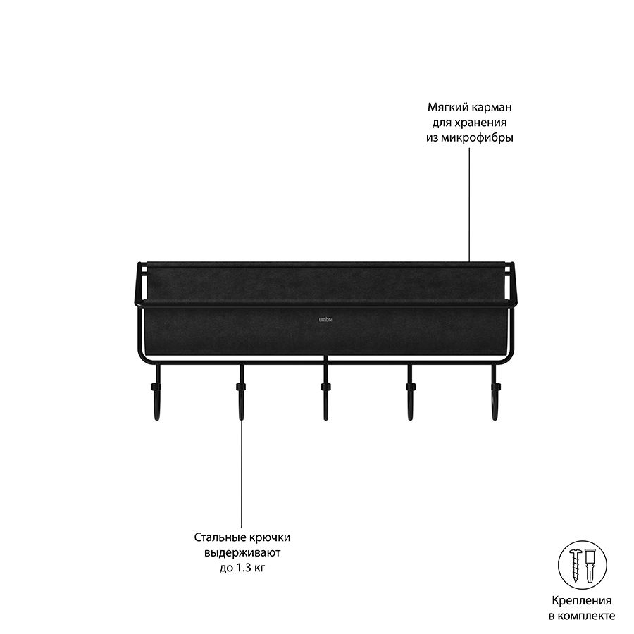 Аксессуар состоит из , ,5 крючков и вместительного кармана для хранения личных вещей, который выполнен из мягкого полиэстера, способного защитить телефон, очки и другие предметы от царапин и повреждений.