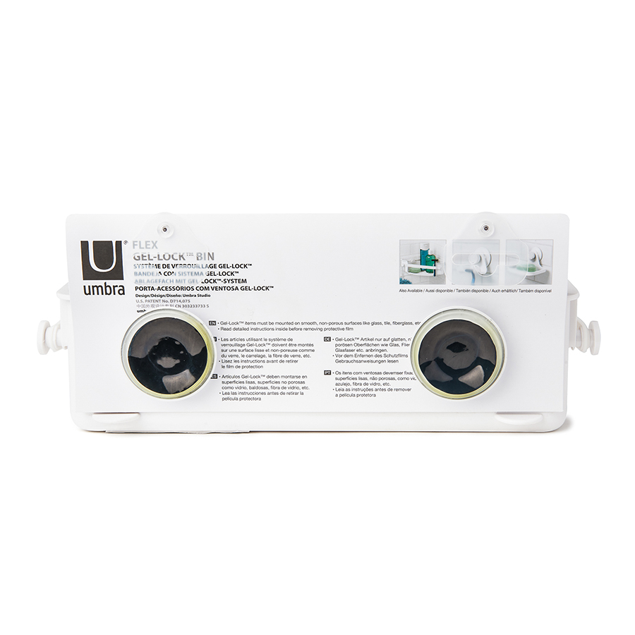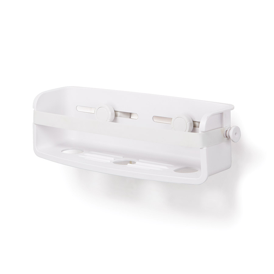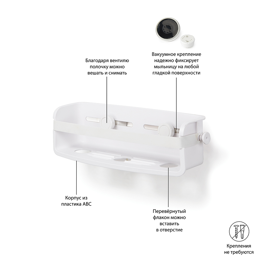 Крепится к стене на две специально разработанные присоски с запатентованной технологией Gel-Lock™. Крепления прочно удерживаются на плитке, стекле и других гладких поверхностях. В полочке предусмотрено отверстие, чтобы перевернув пузырек вверх ногами, вы использовали его как диспенсер. Благодаря эластичным перемычкам удержит даже самые большие бутылки с гелями и шампунями. Отверстия в полочке не дадут воде застаиваться. , ,Максимальная нагрузка – 3,4 кг.