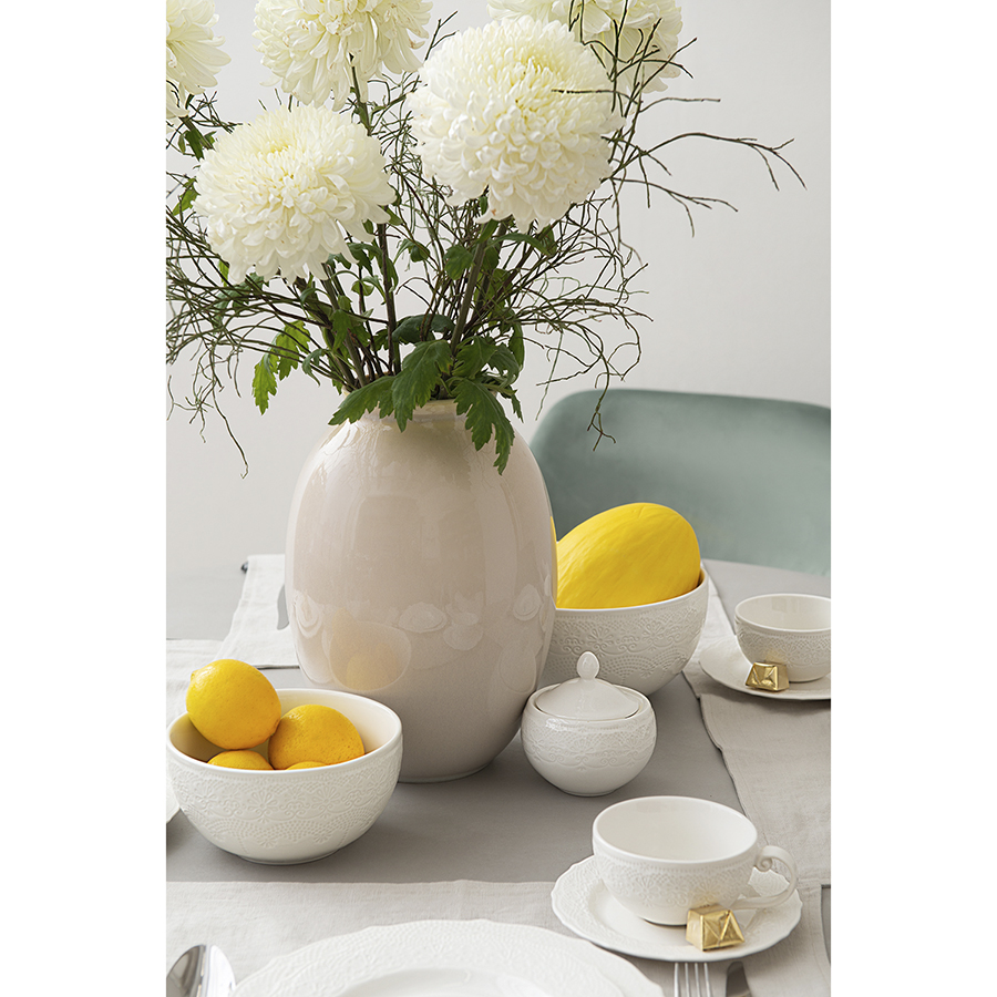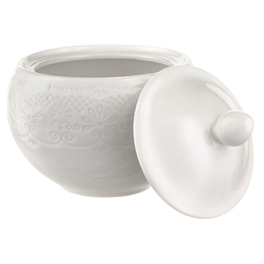Сахарница фарфоровая Tracery – прекрасное решение для повседневной и праздничной сервировки стола. Изюминкой линейки является необычная, приятная на ощупь рельефная поверхность, которая придает посуде интересный вид. Материал изготовления является экологичным, легко моется, не впитывает запахи и загрязнения. Емкость для сахара оснащена крышкой, которая органично завершает силуэт и защищает содержимое от пыли, влаги и заветривания.