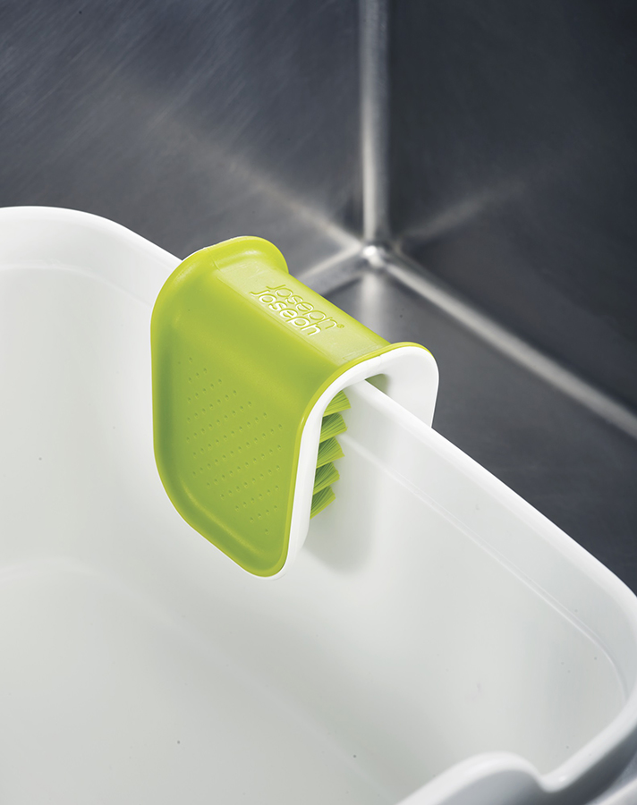 Специальная конструкция позволяет очищать две стороны одновременно, что ускоряет процесс уборки и особенно эффективно благодаря перекрестным моющим щетинкам. Внешняя текстурированная поверхность обеспечивает комфортный захват-щетка удобно сидит в руке без риска выскользнуть. Во время сушки или хранения держится на стенке таза, но благодаря компактным размерам не займет много места на раковине.