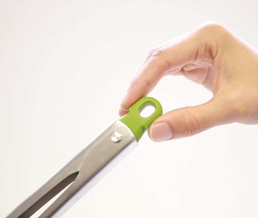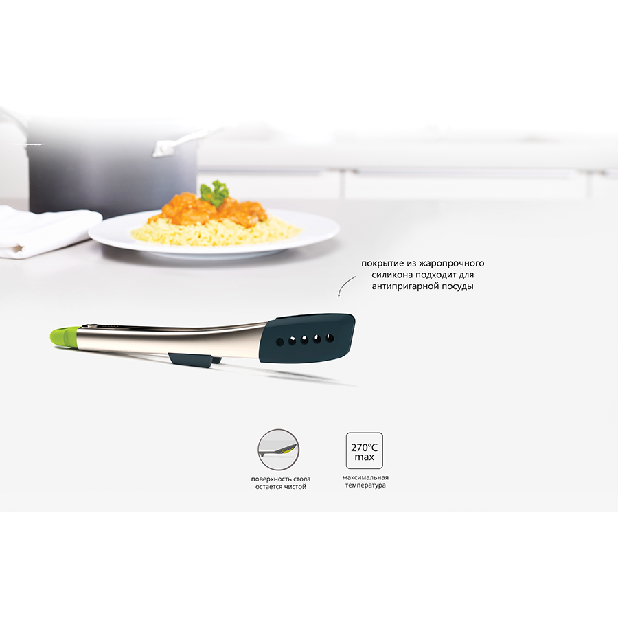 Специальный утяжелитель в рукоятке постоянно удерживает наконечники на весу, благодаря чему они не касаются рабочей поверхности. Запираемый механизм на рукоятке фиксирует щипцы в закрытом положении. Стальные наконечники обеспечивают точное сцепление, что позволяет щипцам справиться с переворачиванием продуктов во время жарки, а также сервировкой готовых блюд.