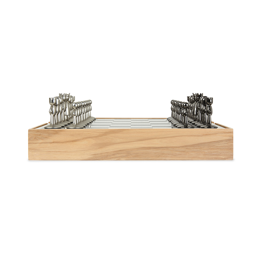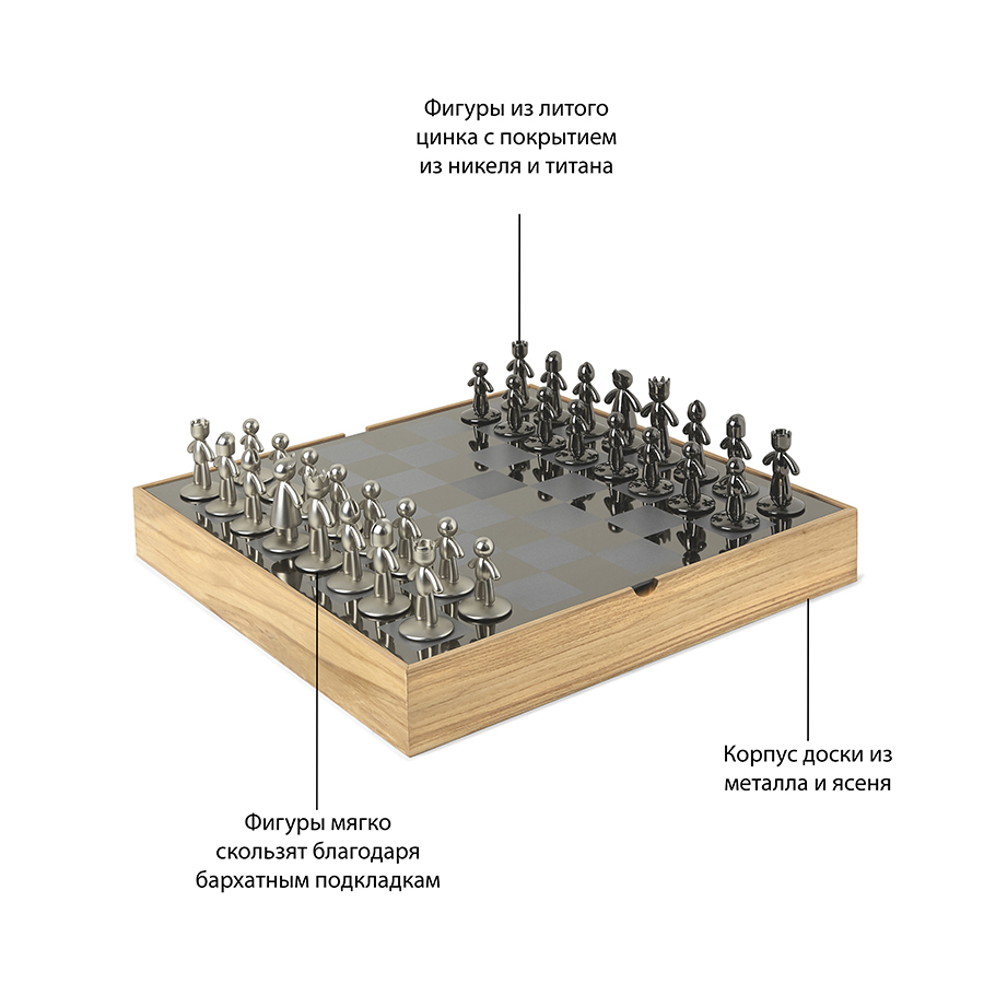 Шахматные фигуры выполенены из металла с никелевым и титановым покрытиями и бархатными накладками на основании, которые защищают поле от царпапин. Металлическое шахматное поле заключено в деревянную коробку из натурального ясеня, которая также служит местом для хранения шахматных фигур.