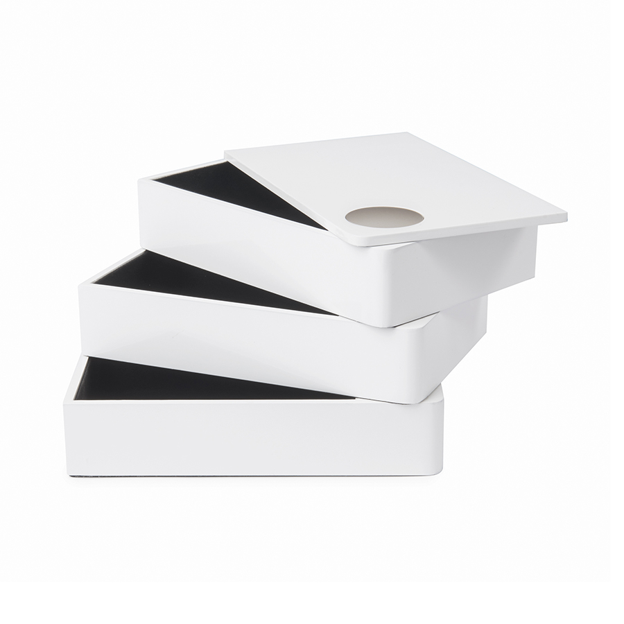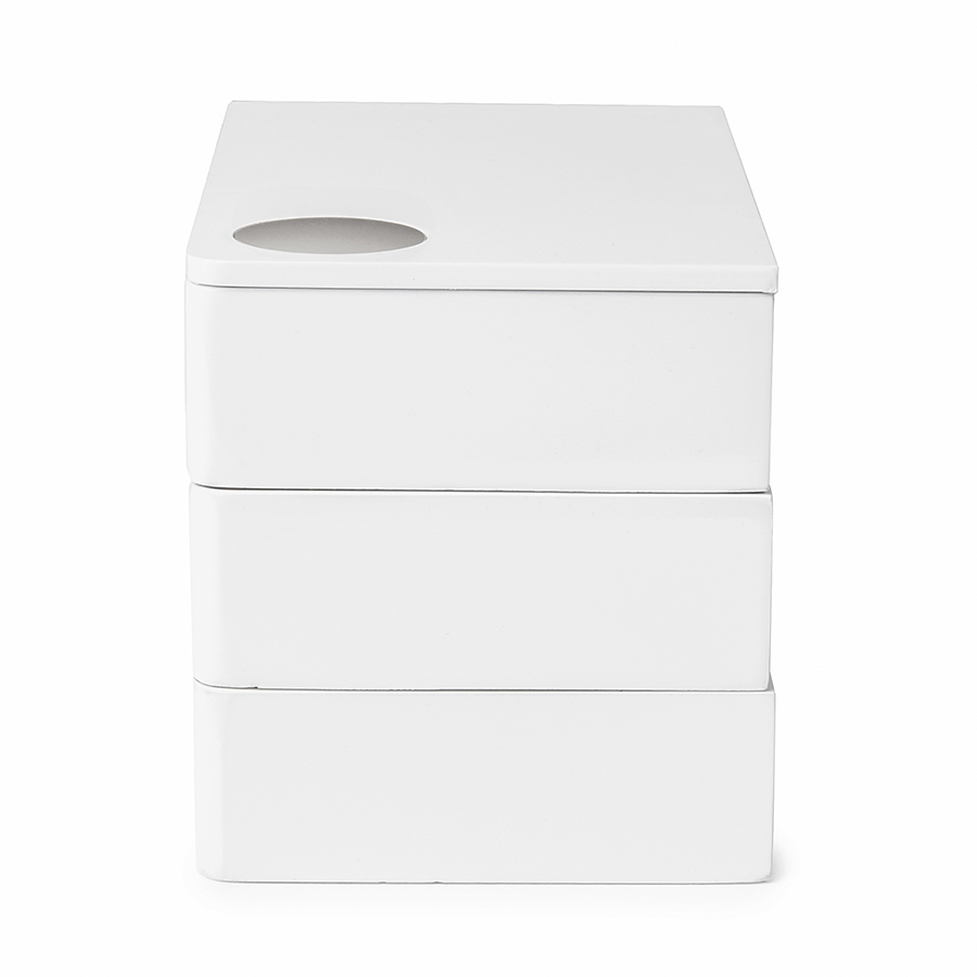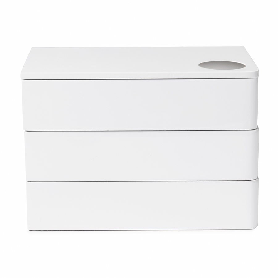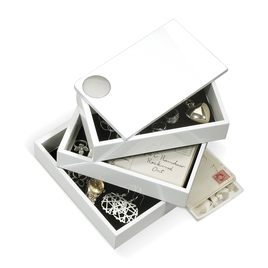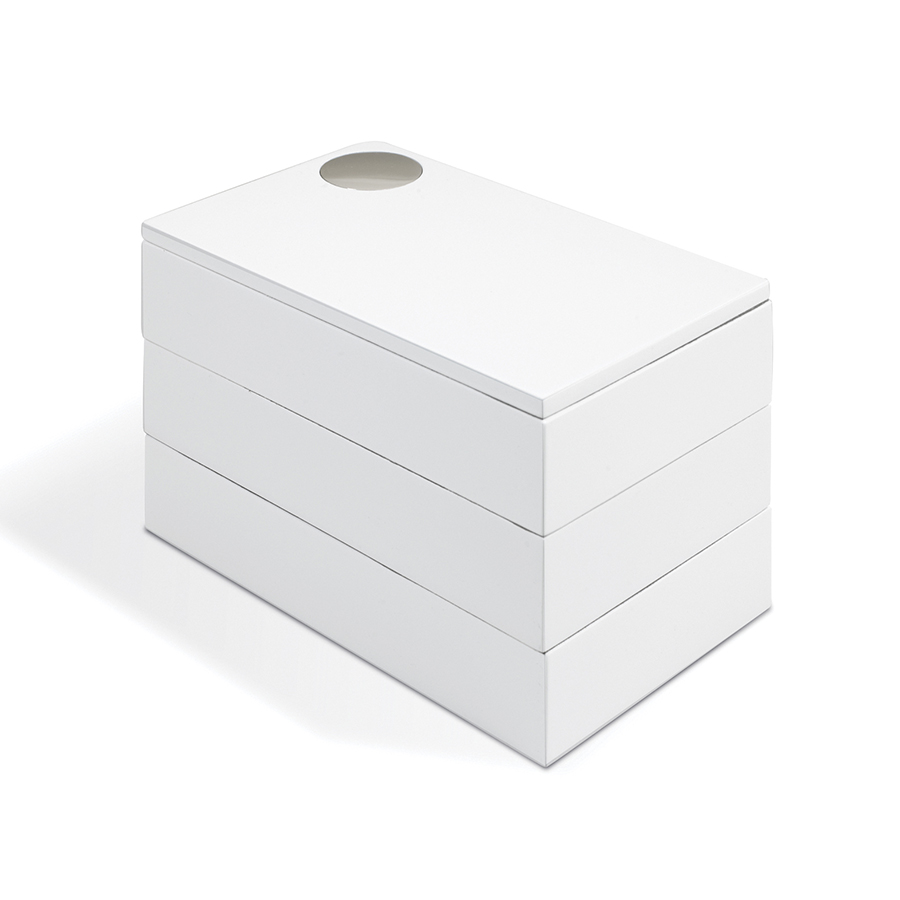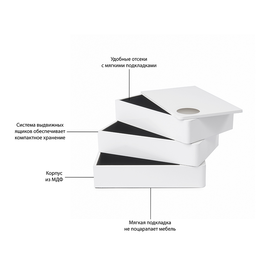 Шкатулка оборудована надежной магнитной защелкой. Три отделения позволяют хранить кольца, серьги, браслеты, часы, ожерелья и другие аксессуары. Ящики и дно шкатулки защищены мягкой тканью для предотвращения повреждений украшений и мебели. Ящики вращаются на шарнире, поворачиваясь на 360 градусов.