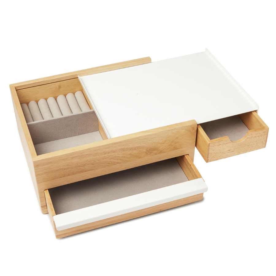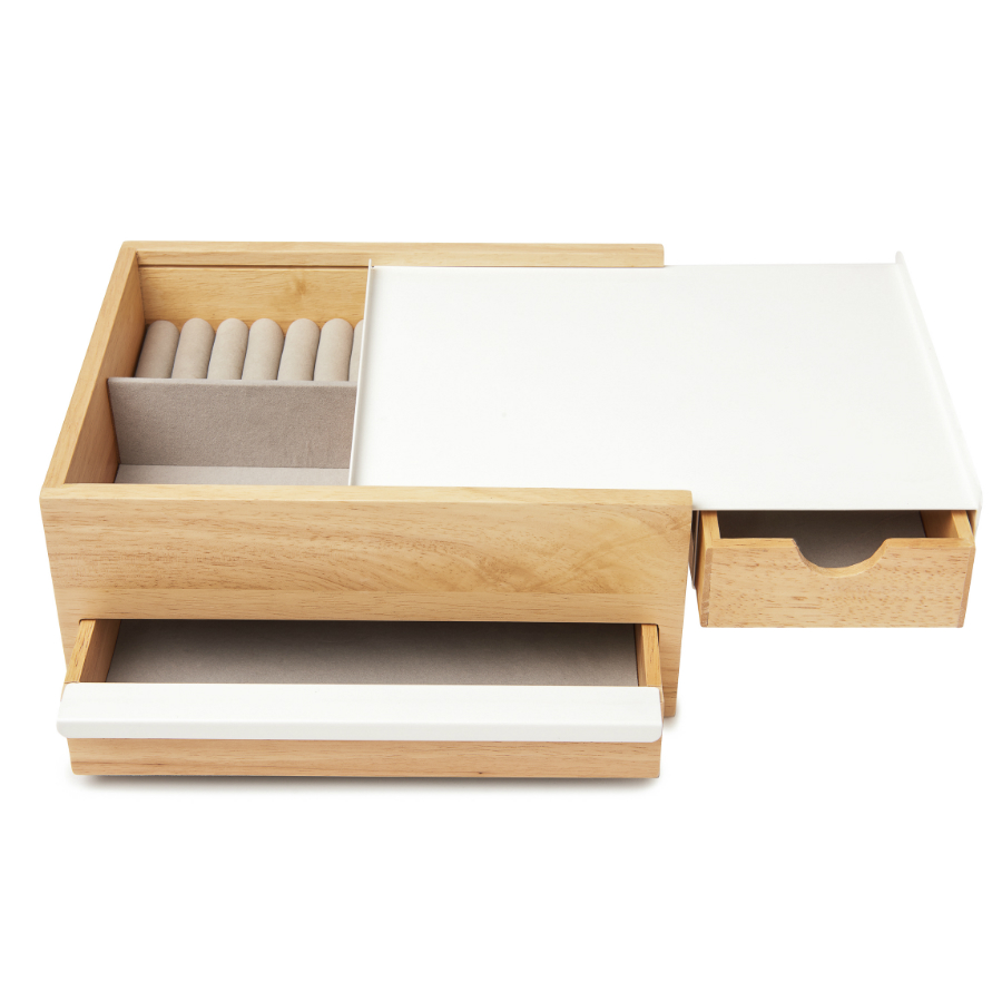 Верхнее отделение оснащено кармашками для колец или запонок и небольшими ящичками для прочих мелочей. Нижняя часть предназначена для хранения более крупных аксессуаров: часов или браслетов.