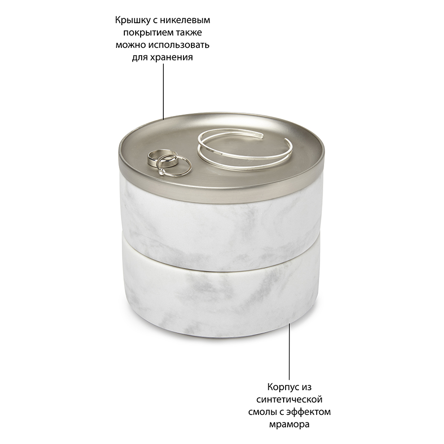 Шкатулка имеет тканевую подкладку и мягкое дно, которые защищают украшения и столешницу от царапин. Металлическая крышка служит лотком для хранения и демонстрации украшений, которые используются чаще других. Секции ставятся одна на другую, поэтому шкатулка не занимает много места.