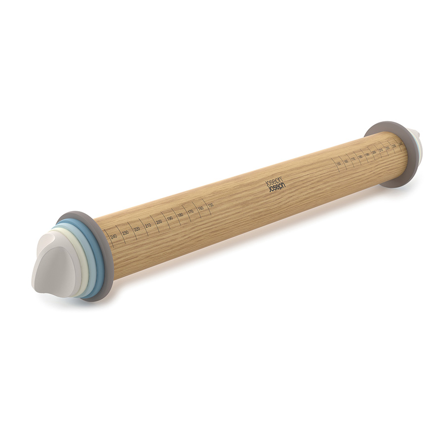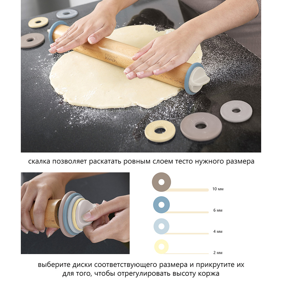 В набор входят четыре комплекта съемных дисков, которые поднимают скалку на разную высоту, позволяя регулировать толщину получаемых коржей: 2 мм, 4 мм, 6 мм или 10 мм. Продуманная конструкция гарантирует равномерную толщину теста, а нанесенная на скалку разметка позволит определить ширину коржа.