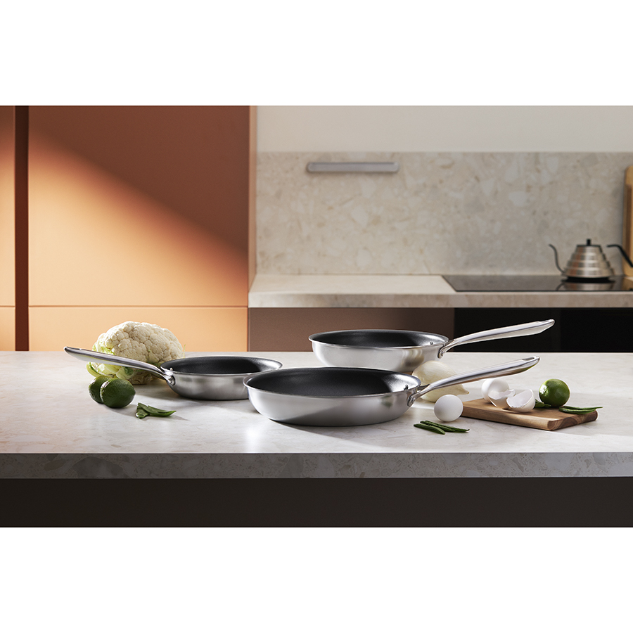 Посуда из нержавеющей стали 3Ply Etalon изготовлена по инновационной технологии TRI-PLY – ее стенки и дно имеют два слоя стали, между которыми предусмотрен слой алюминия. Эта особенность обеспечивает изделиям превосходную теплопроводность, практичность и долговечность. Коллекция идеально подходит для любых типов плит и впечатляет трендовым дизайном – сочетание современных форм и матовой поверхности делает ее настоящим украшением любой кухни.