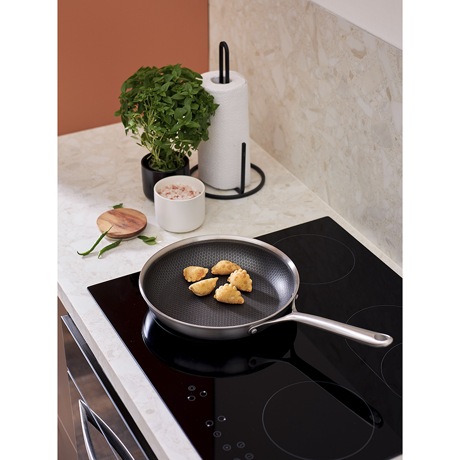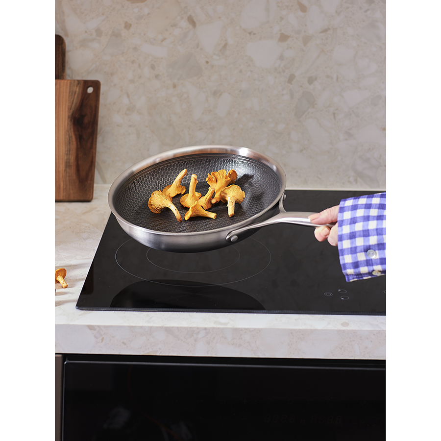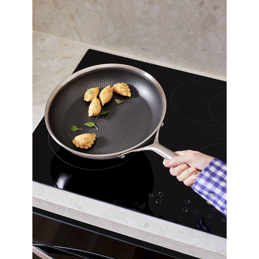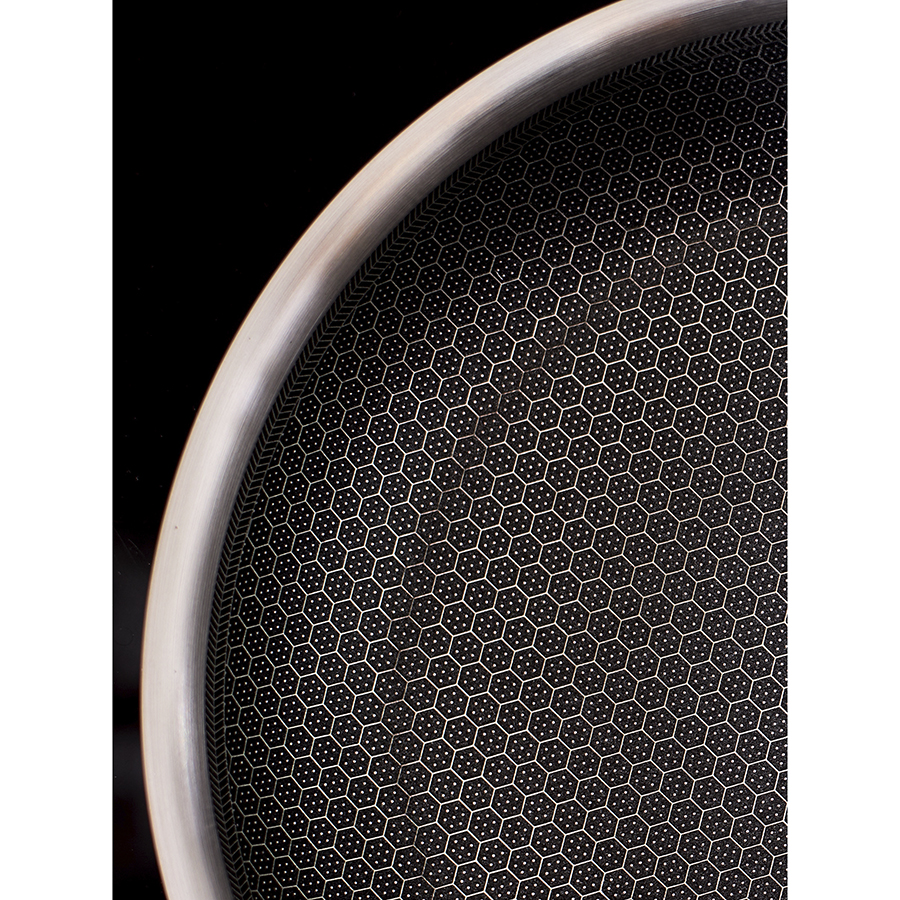 - Структурное дно Honeycomb с лазерным напылением устойчиво к царапинам и повреждениям, что позволяет использовать металлические кухонные инструменты.
