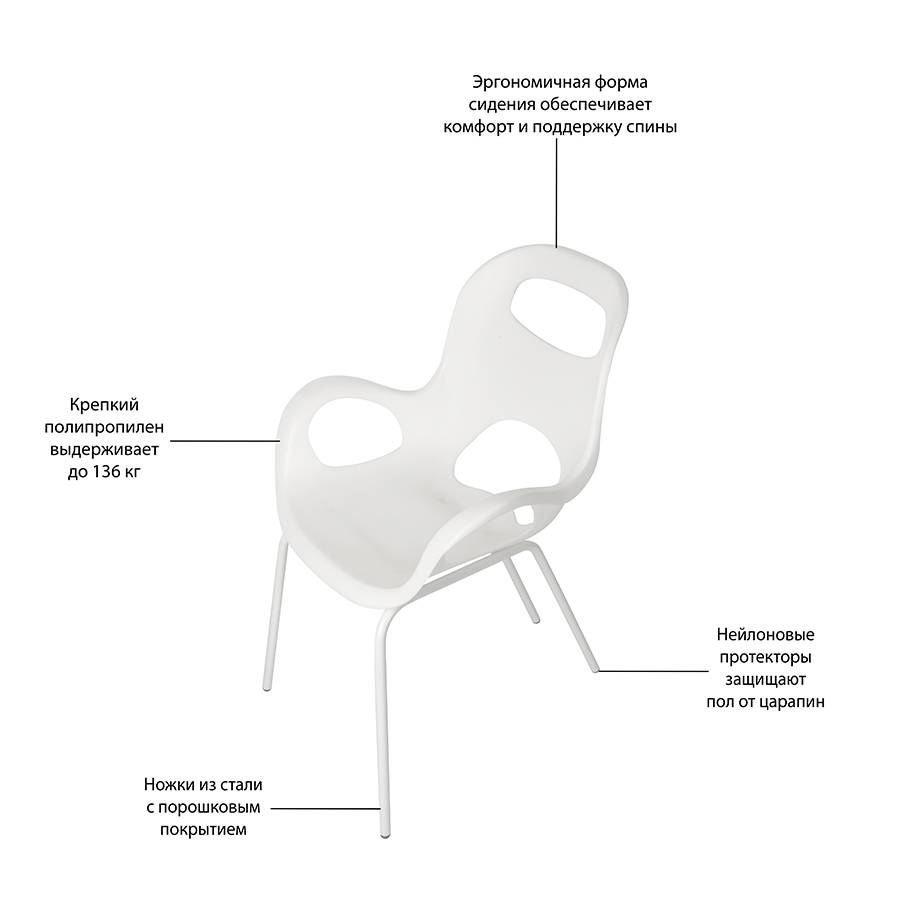Сиденье из прочного полипропилена (,выдерживает до 136 кг),, со специальным матовым покрытием плюс ножки того же цвета, на концах оснащенные нейлоновыми протекторами – благодаря им стул не царапает пол. Эргономичный дизайн обеспечивает комфорт и поддержку спины.