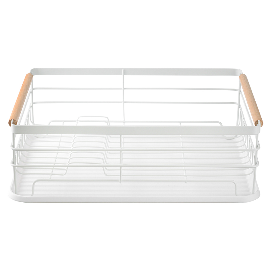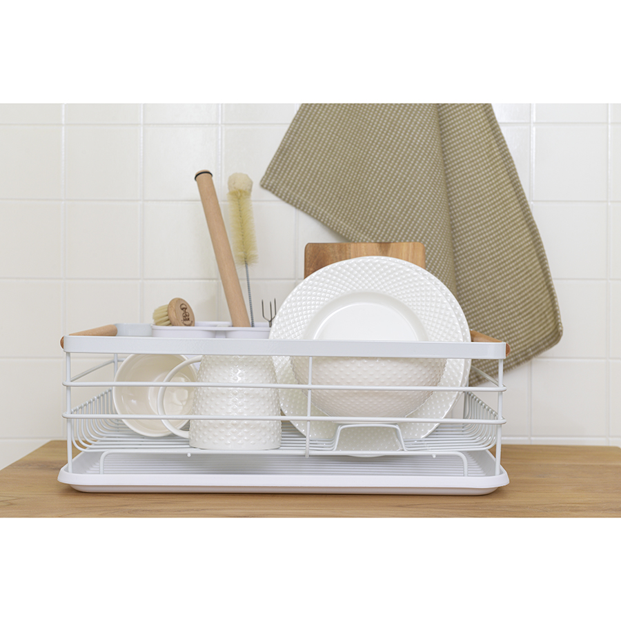 Сушилка Granli представляет собой эргономичную конструкцию с отделениями для посуды и кухонных принадлежностей. Каркас имеет вид железной сетки со специальными изгибами, позволяющими удобно разместить тарелки и другие емкости. Поддон выполнен из практичного пластика, который легко очищается от загрязнений. Предусмотрены специальные съемные контейнеры для столовых приборов, на дне которых имеются отверстия для слива воды. Сушилку легко перемещать благодаря деревянным ручкам.