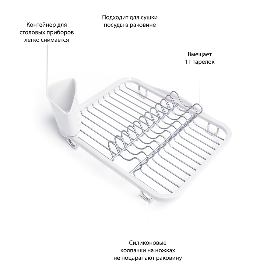 Предусмотрены отсеки для тарелок и чашек. Съемный пластиковый контейнер удобен для сушки столовых приборов. Благодаря специальным ножкам вода стекает в раковину, не застаиваясь под посудой. Пластиковые насадки на ножках оберегают раковину от царапин. , ,Металлическая решетка и пластиковое обрамление легко очищаются от загрязнений.