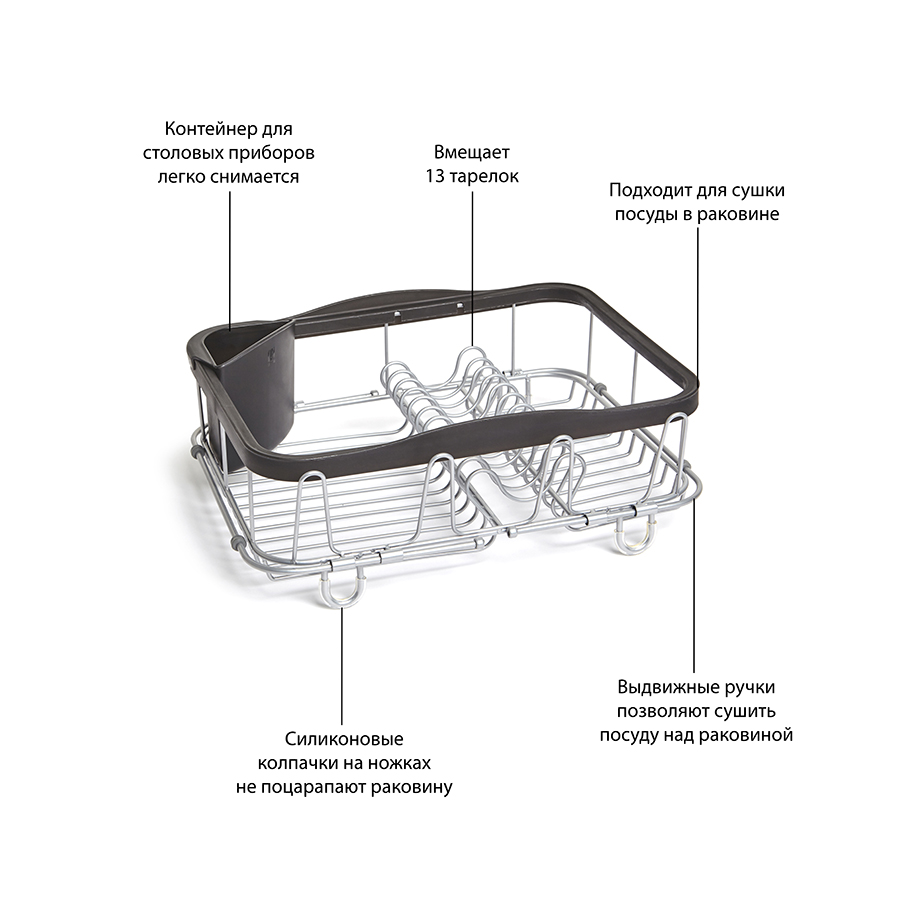 Раздвигающиеся ручки добавлены для удобного хранения над раковиной (,если там размораживаются продукты, например),. С боковой стороны добавлены 4 удобных выступа для сушки стаканов или чашек. В комплект входит съемный уголок для хранения столовых приборов. Ручки раздвигаются до 48.5 см.
