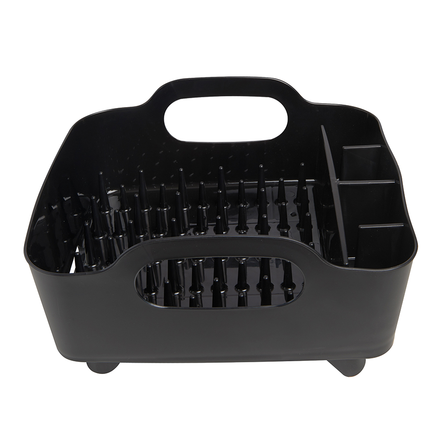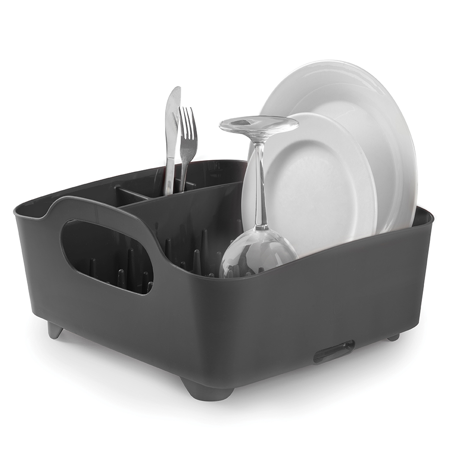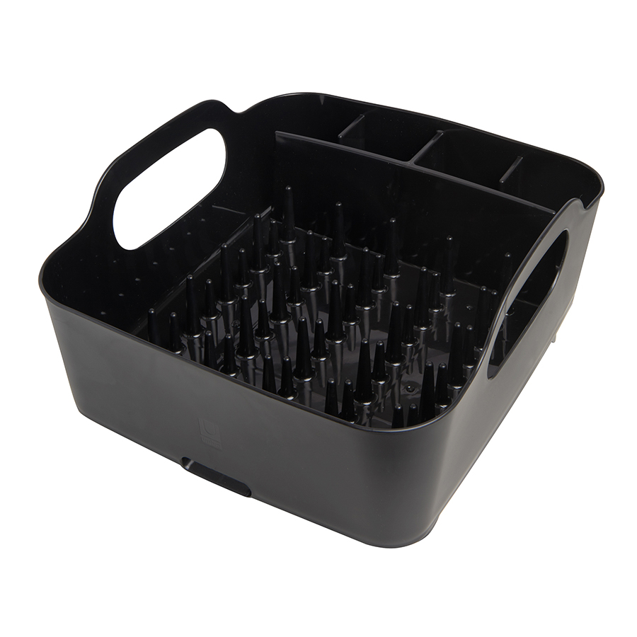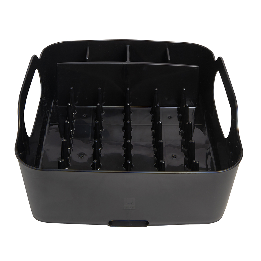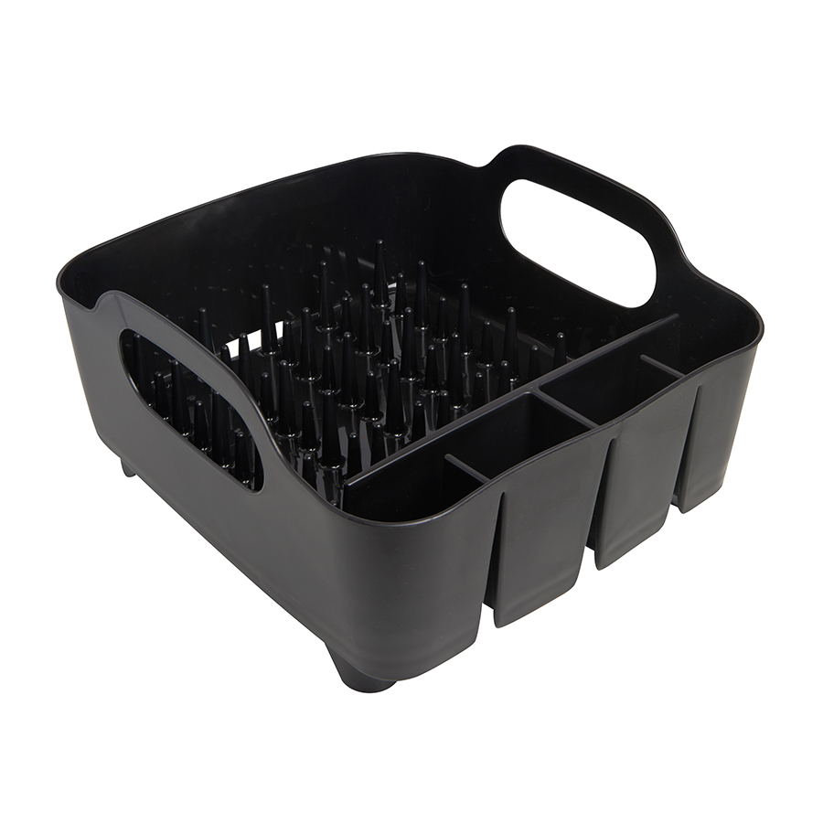 Мобильная сушилка для посуды состоит из пяти отделений: широкого — для сушки тарелок, чашек и сотейников и четыре маленьких для столовых приборов и аксессуаров. Выступы разной высоты на дне , ,сушилки позволяют аккуратно расставить посуду. Благодаря ножкам и отверстию для слива, вода не будет , ,застаиваться, что предотвратит появление неприятного запаха.