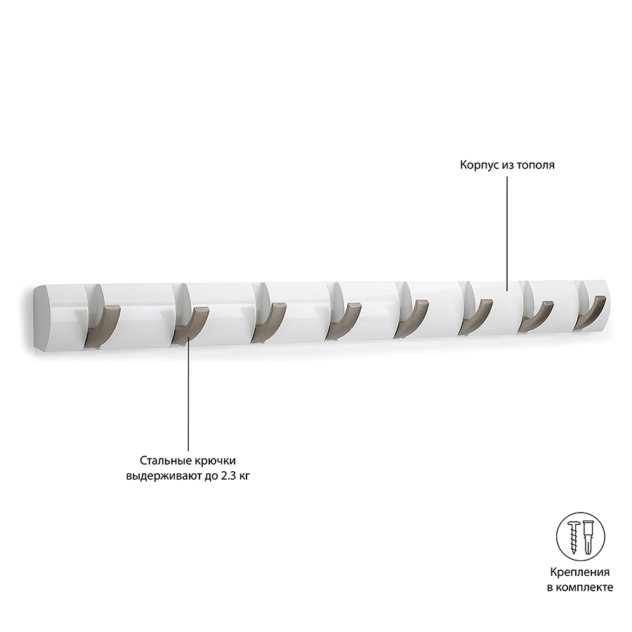 Вешалка настенная горизонтальная Flip 8 крючков белая, Umbra