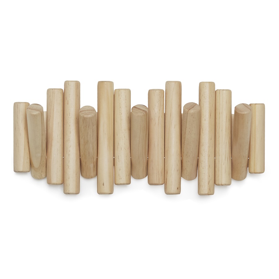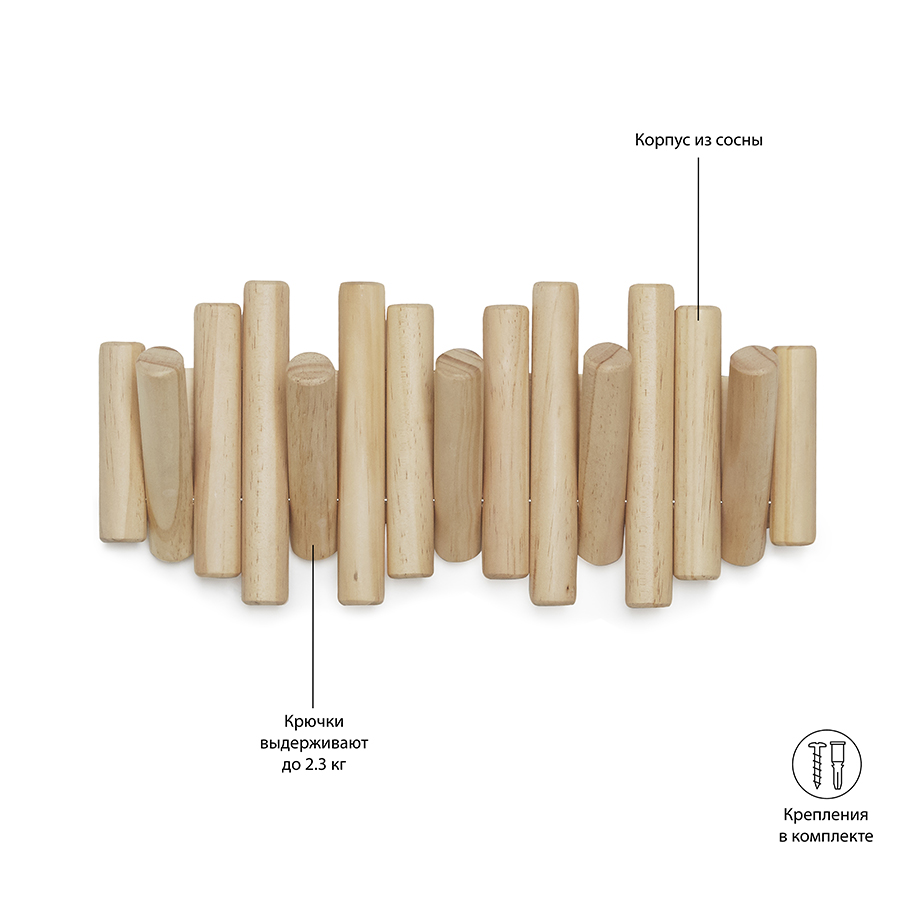 Вешалка состоит из сосновых колышков разных размеров. Аксессуар снабжен 5 складными крючками, которые способны выдерживать вес до 2,25 кг. Вешалка поставляется с набором крепежа.